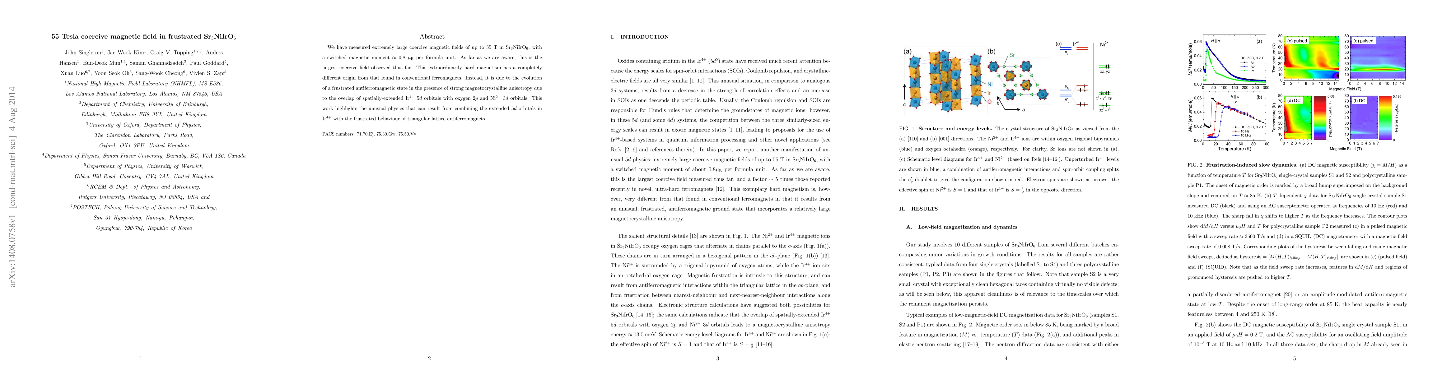 We have measured extremely large coercive magnetic fields of up to 55~T in Sr$_3$NiIrO$_6$, with a switched magnetic moment $\approx 0.8~\mu_{\rm B}$ per formula unit. As far as we are aware, this is the largest coercive field observed thus far. This extraordinarily hard magnetism has a completely different origin from that found in conventional ferromagnets. Instead, it is due to the evolution of a frustrated antiferromagnetic state in the presence of strong magnetocrystalline anisotropy due to the overlap of spatially-extended Ir$^{4+}$ 5$d$ orbitals with oxygen 2$p$ and Ni$^{2+}$ 3$d$ orbitals. This work highlights the unusual physics that can result from combining the extended $5d$ orbitals in Ir$^{4+}$ with the frustrated behaviour of triangular lattice antiferromagnets.