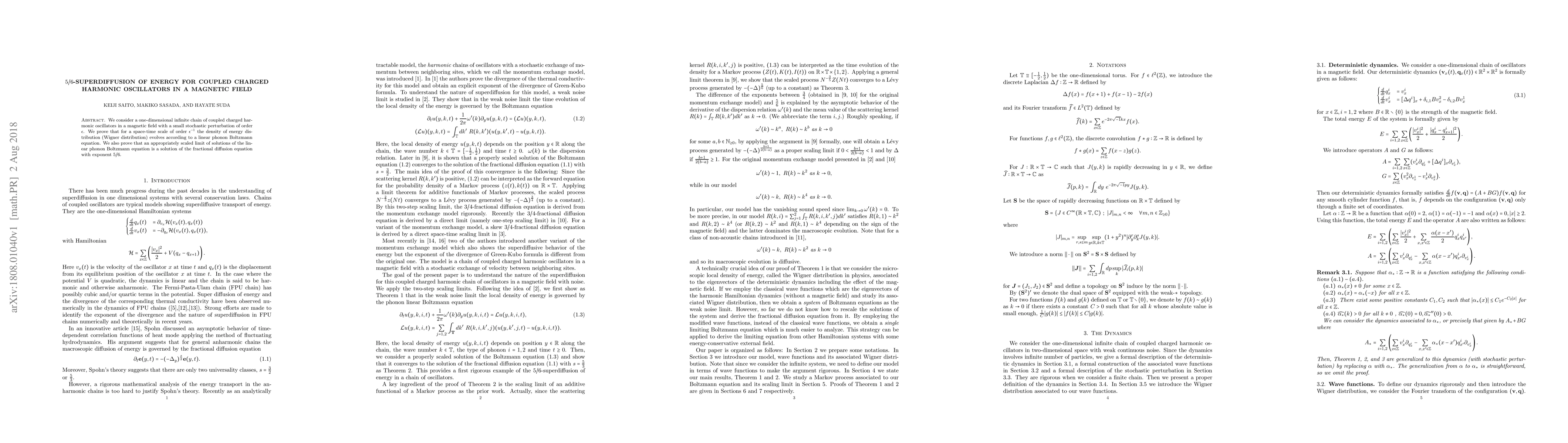 This research proves that in a chain of coupled charged oscillators under a magnetic field and small stochastic perturbation, the energy density evolves via a linear phonon Boltzmann equation at a scale of $epsilon$^{-1}$. Furthermore, it shows that this evolution approximates a fractional diffusion equation with an exponent of 5/6.