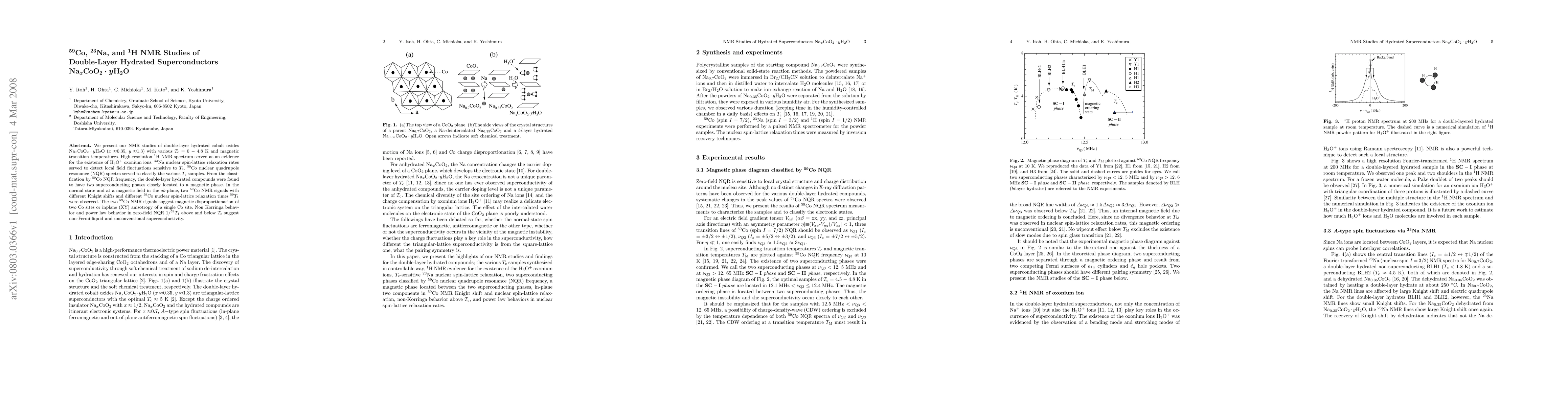 This work distinguishes itself by combining high-resolution $^{1}$H, $^{23}$Na, and $^{59}$Co NMR studies to classify superconducting phases and probe local field fluctuations, magnetic disproportionation, and unconventional superconductivity in double-layer hydrated cobalt oxides.