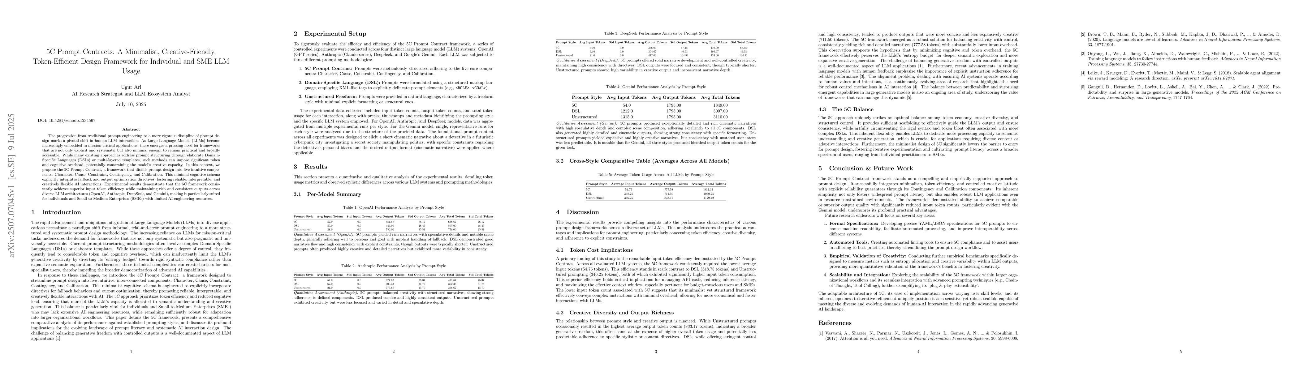 The progression from traditional prompt engineering to a more rigorous discipline of prompt design marks a pivotal shift in human-LLM interaction. As Large Language Models (LLMs) become increasingly embedded in mission-critical applications, there emerges a pressing need for frameworks that are not only explicit and systematic but also minimal enough to remain practical and broadly accessible. While many existing approaches address prompt structuring through elaborate Domain-Specific Languages (DSLs) or multi-layered templates, such methods can impose significant token and cognitive overhead, potentially constraining the model's creative capacity. In this context, we propose the 5C Prompt Contract, a framework that distills prompt design into five intuitive components: Character, Cause, Constraint, Contingency, and Calibration. This minimal cognitive schema explicitly integrates fallback and output optimization directives, fostering reliable, interpretable, and creatively flexible AI interactions. Experimental results demonstrate that the 5C framework consistently achieves superior input token efficiency while maintaining rich and consistent outputs across diverse LLM architectures (OpenAI, Anthropic, DeepSeek, and Gemini), making it particularly suited for individuals and Small-to-Medium Enterprises (SMEs) with limited AI engineering resources.