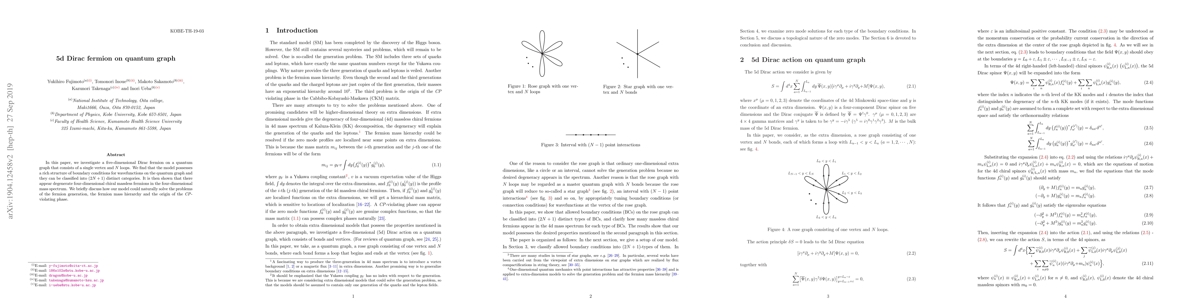 This paper explores a five-dimensional Dirac fermion on a quantum graph with a single vertex and $N$ loops, revealing $(2N+1)$ distinct boundary condition categories for wavefunctions. The study finds that the model generates degenerate four-dimensional chiral massless fermions, potentially addressing fermion generation, mass hierarchy, and $CP$-violation.