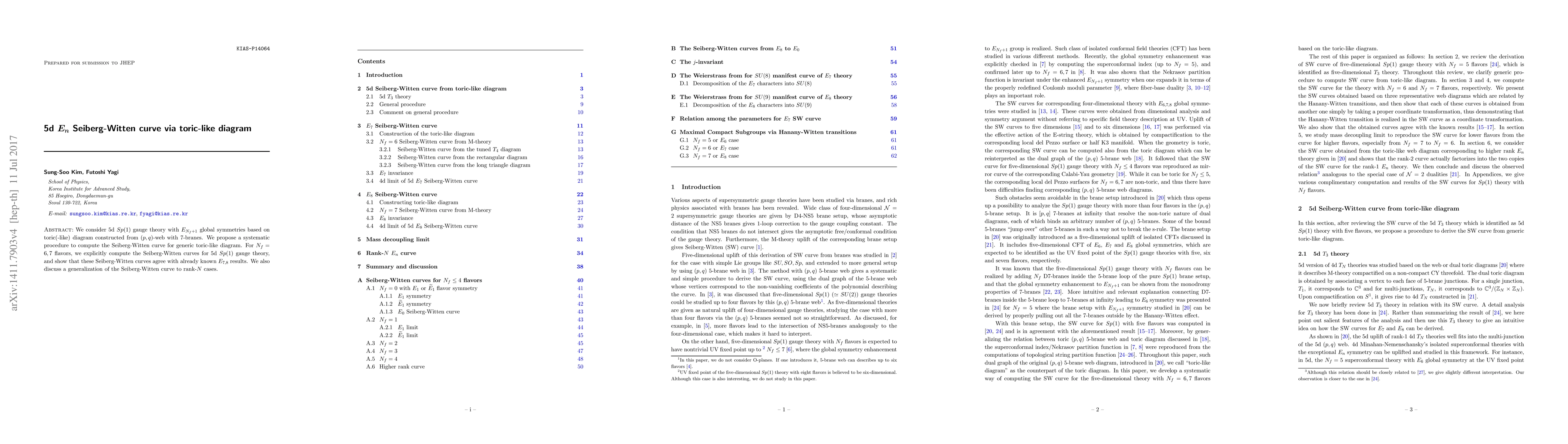 We consider 5d Sp(1) gauge theory with $E_{N_f+1}$ global symmetries based on toric(-like) diagram constructed from (p,q)-web with 7-branes. We propose a systematic procedure to compute the Seiberg-Witten curve for generic toric-like diagram. For $N_f=6,7$ flavors, we explicitly compute the Seiberg-Witten curves for 5d Sp(1) gauge theory, and show that these Seiberg-Witten curves agree with already known $E_{7,8}$ results. We also discuss a generalization of the Seiberg-Witten curve to rank-N cases.