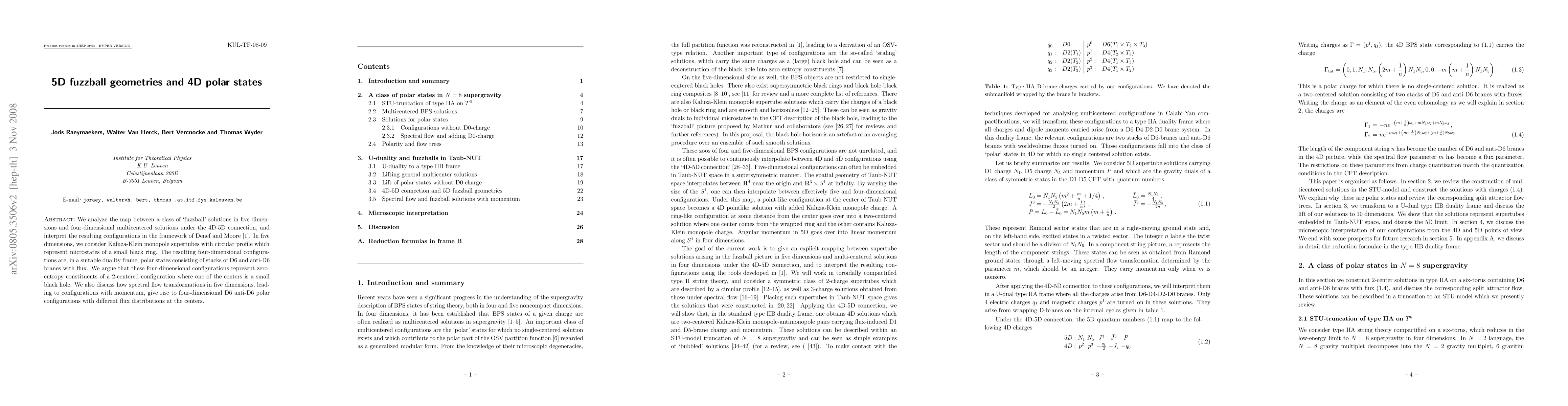 We analyze the map between a class of `fuzzball' solutions in five dimensions and four-dimensional multicentered solutions under the 4D-5D connection, and interpret the resulting configurations in the framework of Denef and Moore. In five dimensions, we consider Kaluza-Klein monopole supertubes with circular profile which represent microstates of a small black ring. The resulting four-dimensional configurations are, in a suitable duality frame, polar states consisting of stacks of D6 and anti-D6 branes with flux. We argue that these four-dimensional configurations represent zero-entropy constituents of a 2-centered configuration where one of the centers is a small black hole. We also discuss how spectral flow transformations in five dimensions, leading to configurations with momentum, give rise to four-dimensional D6 anti-D6 polar configurations with different flux distributions at the centers.