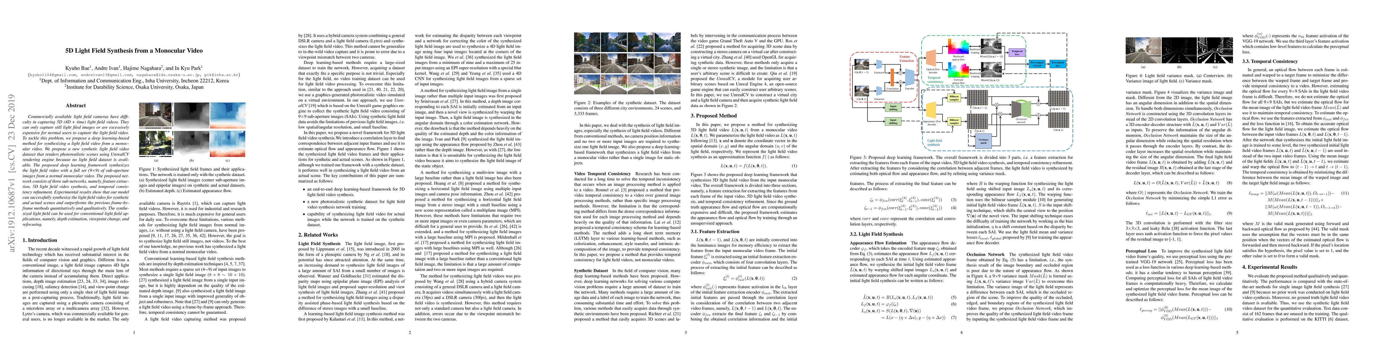 This paper proposes a deep learning method to synthesize 5D light field videos from a single monocular video, addressing the limitations of current light field cameras. The method uses a synthetic dataset created with UnrealCV and consists of three sub-networks for feature extraction, light field synthesis, and temporal consistency, outperforming previous frame-by-frame methods.