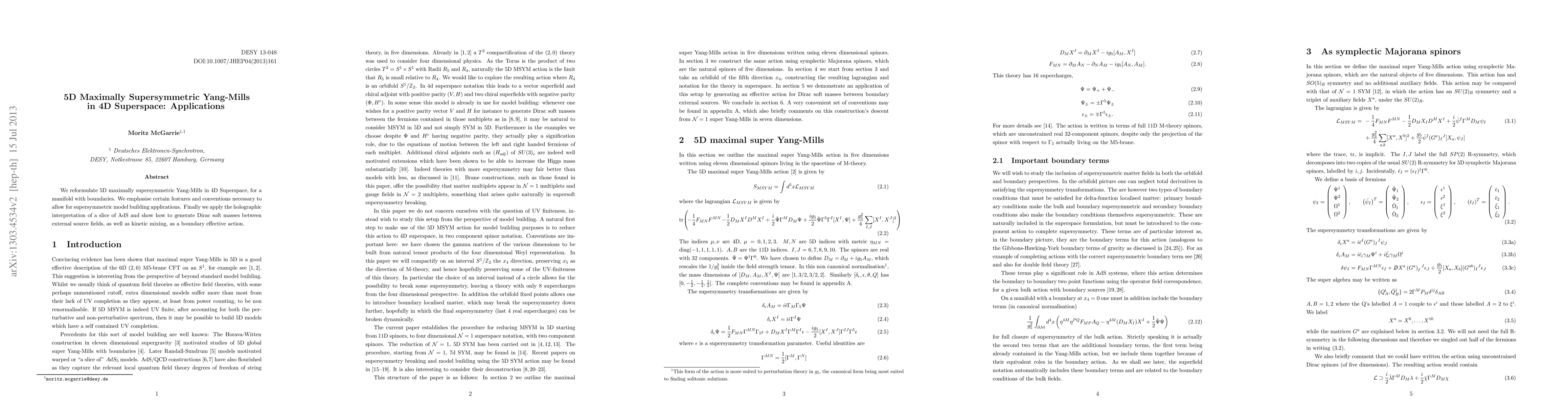This paper reformulates 5D maximally supersymmetric Yang-Mills theory in 4D superspace for manifolds with boundaries, emphasizing features for supersymmetric model building. It also applies holographic interpretation to generate Dirac soft masses and kinetic mixing as boundary effective actions.