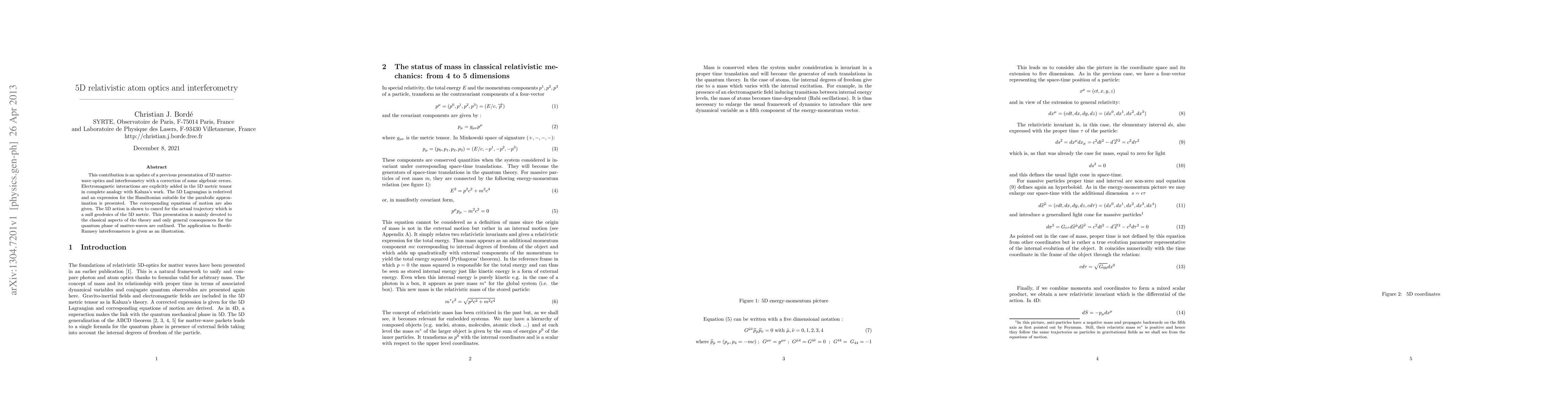 This contribution is an update of a previous presentation of 5D matter- wave optics and interferometry with a correction of some algebraic errors. Electromagnetic interactions are explicitly added in the 5D metric tensor in complete analogy with Kaluza's work. The 5D Lagrangian is rederived and an expression for the Hamiltonian suitable for the parabolic approximation is presented. The corresponding equations of motion are also given. The 5D action is shown to cancel for the actual trajectory which is a null geodesics of the 5D metric. This presentation is mainly devoted to the classical aspects of the theory and only general consequences for the quantum phase of matter-waves are outlined. The application to Bord\'e- Ramsey interferometers is given as an illustration.