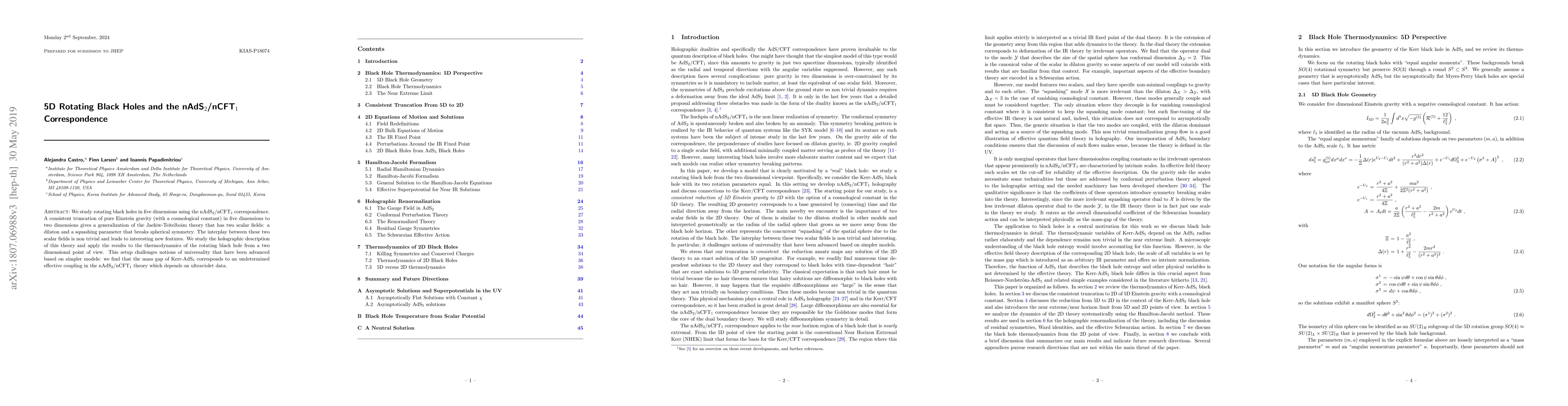 We study rotating black holes in five dimensions using the nAdS$_2$/nCFT$_1$ correspondence. A consistent truncation of pure Einstein gravity (with a cosmological constant) in five dimensions to two dimensions gives a generalization of the Jackiw-Teitelboim theory that has two scalar fields: a dilaton and a squashing parameter that breaks spherical symmetry. The interplay between these two scalar fields is non trivial and leads to interesting new features. We study the holographic description of this theory and apply the results to the thermodynamics of the rotating black hole from a two dimensional point of view. This setup challenges notions of universality that have been advanced based on simpler models: we find that the mass gap of Kerr-AdS$_5$ corresponds to an undetermined effective coupling in the nAdS$_2$/nCFT$_1$ theory which depends on ultraviolet data.
