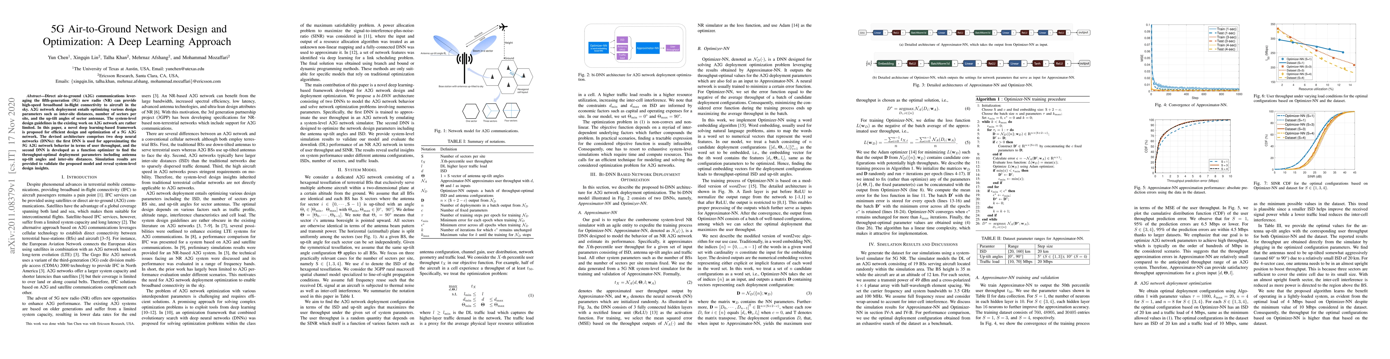 Direct air-to-ground (A2G) communications leveraging the fifth-generation (5G) new radio (NR) can provide high-speed broadband in-flight connectivity to aircraft in the sky. A2G network deployment entails optimizing various design parameters such as inter-site distances, number of sectors per site, and the up-tilt angles of sector antennas. The system-level design guidelines in the existing work on A2G network are rather limited. In this paper, a novel deep learning-based framework is proposed for efficient design and optimization of a 5G A2G network. The devised architecture comprises two deep neural networks (DNNs): the first DNN is used for approximating the 5G A2G network behavior in terms of user throughput, and the second DNN is developed as a function optimizer to find the throughput-optimal deployment parameters including antenna up-tilt angles and inter-site distances. Simulation results are provided to validate the proposed model and reveal system-level design insights.