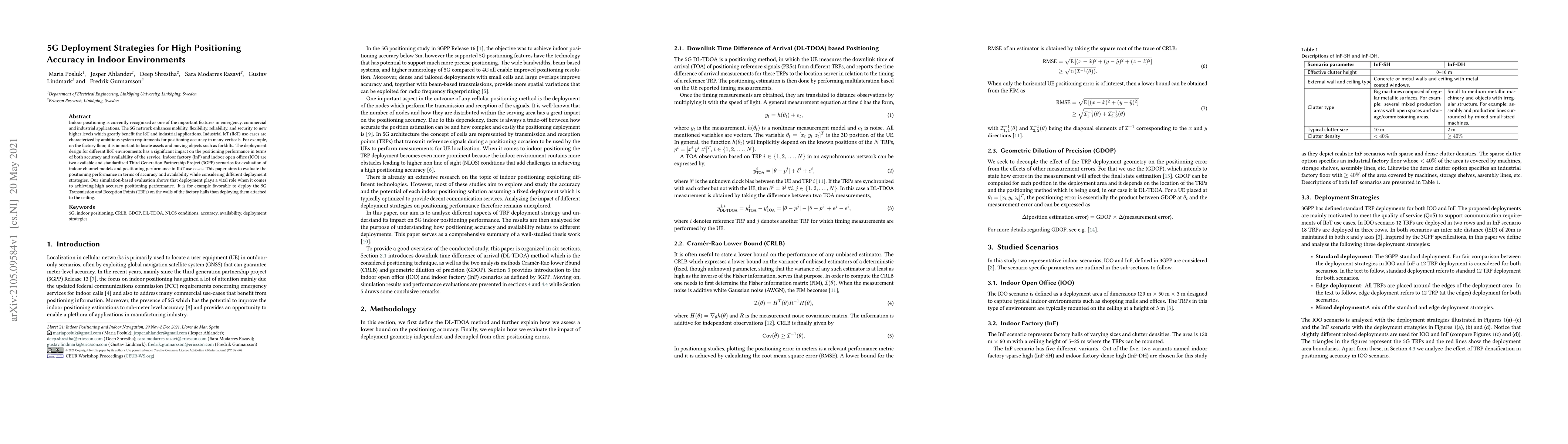 Indoor positioning is currently recognized as one of the important features in emergency, commercial and industrial applications. The 5G network enhances mobility, flexibility, reliability, and security to new higher levels which greatly benefit the IoT and industrial applications. Industrial IoT (IIoT) use-cases are characterized by ambitious system requirements for positioning accuracy in many verticals. For example, on the factory floor, it is important to locate assets and moving objects such as forklifts. The deployment design for different IIoT environments has a significant impact on the positioning per-performance in terms of both accuracy and availability of the service. Indoor factory (InF) and indoor open office (IOO) are two available and standardized Third Generation Partnership Project (3GPP) scenarios for evaluation of indoor channel models and positioning performance in IIoT use cases. This paper aims to evaluate the positioning performance in terms of accuracy and availability while considering different deployment strategies. Our simulation-based evaluation shows that deployment plays a vital role when it comes to achieving high accuracy positioning performance. It is for example favorable to deploy the 5G Transmission and Reception Points (TRPs) on the walls of the factory halls than deploying them attached to the ceiling.