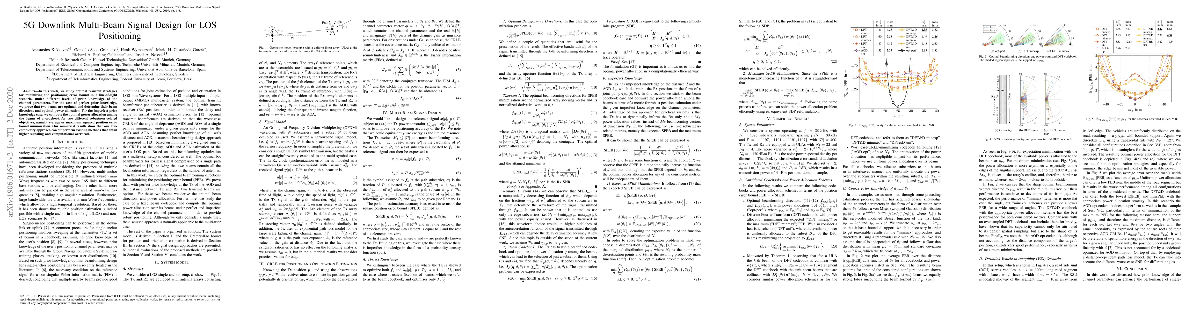 In this work, we study optimal transmit strategies for minimizing the positioning error bound in a line-of-sight scenario, under different levels of prior knowledge of the channel parameters. For the case of perfect prior knowledge, we prove that two beams are optimal, and determine their beam directions and optimal power allocation. For the imperfect prior knowledge case, we compute the optimal power allocation among the beams of a codebook for two different robustness-related objectives, namely average or maximum squared position error bound minimization. Our numerical results show that our low-complexity approach can outperform existing methods that entail higher signaling and computational overhead.