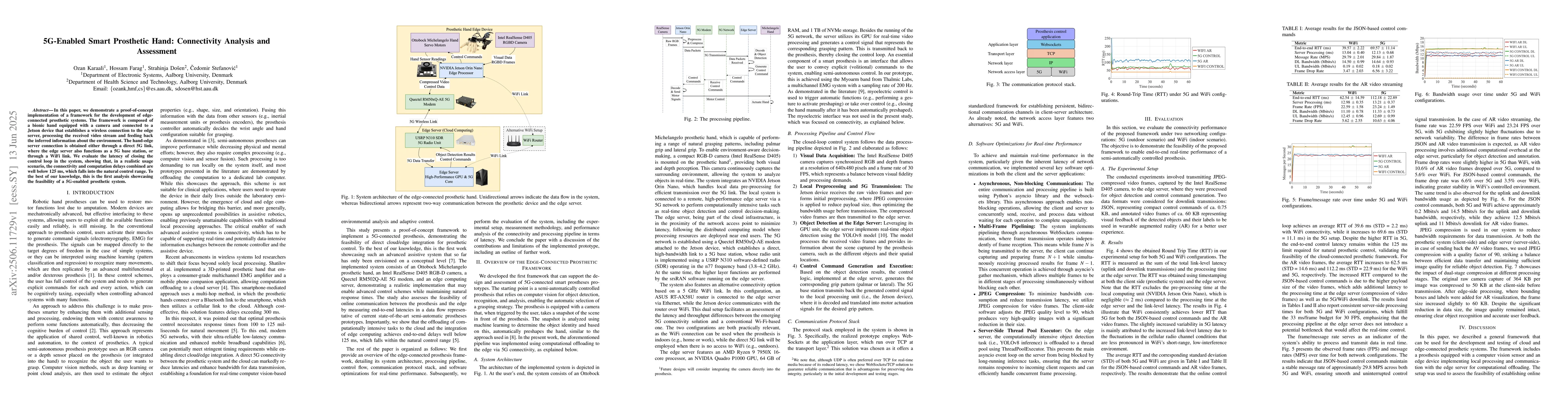 In this paper, we demonstrate a proof-of-concept implementation of a framework for the development of edge-connected prosthetic systems. The framework is composed of a bionic hand equipped with a camera and connected to a Jetson device that establishes a wireless connection to the edge server, processing the received video stream and feeding back the inferred information about the environment. The hand-edge server connection is obtained either through a direct 5G link, where the edge server also functions as a 5G base station, or through a WiFi link. We evaluate the latency of closing the control loop in the system, showing that, in a realistic usage scenario, the connectivity and computation delays combined are well below 125 ms, which falls into the natural control range. To the best of our knowledge, this is the first analysis showcasing the feasibility of a 5G-enabled prosthetic system.
