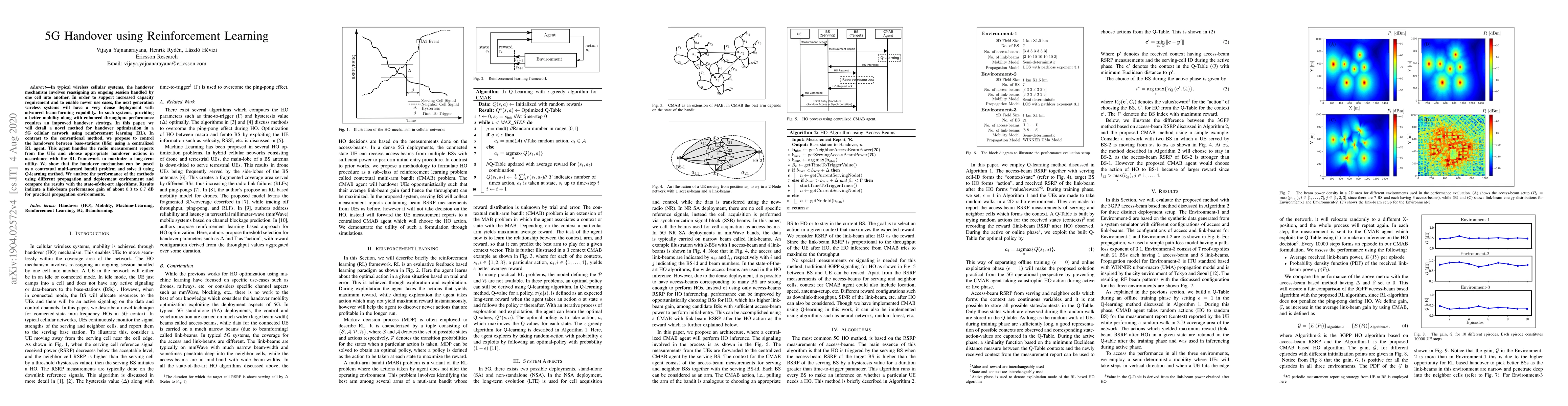 This paper proposes a reinforcement learning-based method for optimizing handovers in 5G networks, using a centralized RL agent to maximize long-term utility. The approach is shown to outperform state-of-the-art algorithms, achieving a link-beam performance gain of 0.3 to 0.7 dB in practical environments.