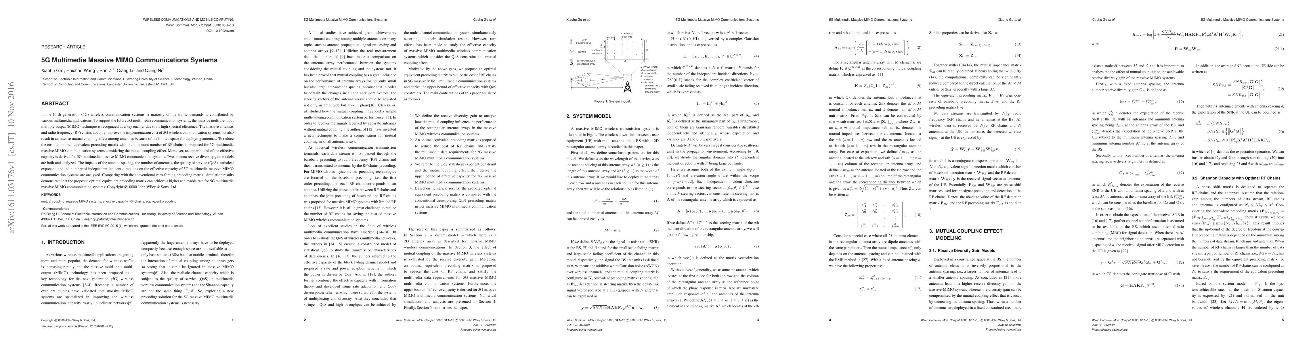 In the Fifth generation (5G) wireless communication systems, a majority of the traffic demands is contributed by various multimedia applications. To support the future 5G multimedia communication systems, the massive multiple-input multiple-output (MIMO) technique is recognized as a key enabler due to its high spectral efficiency. The massive antennas and radio frequency (RF) chains not only improve the implementation cost of 5G wireless communication systems but also result in an intense mutual coupling effect among antennas because of the limited space for deploying antennas. To reduce the cost, an optimal equivalent precoding matrix with the minimum number of RF chains is proposed for 5G multimedia massive MIMO communication systems considering the mutual coupling effect. Moreover, an upper bound of the effective capacity is derived for 5G multimedia massive MIMO communication systems. Two antenna receive diversity gain models are built and analyzed. The impacts of the antenna spacing, the number of antennas, the quality of service (QoS) statistical exponent, and the number of independent incident directions on the effective capacity of 5G multimedia massive MIMO communication systems are analyzed. Comparing with the conventional zero-forcing precoding matrix, simulation results demonstrate that the proposed optimal equivalent precoding matrix can achieve a higher achievable rate for 5G multimedia massive MIMO communication systems.