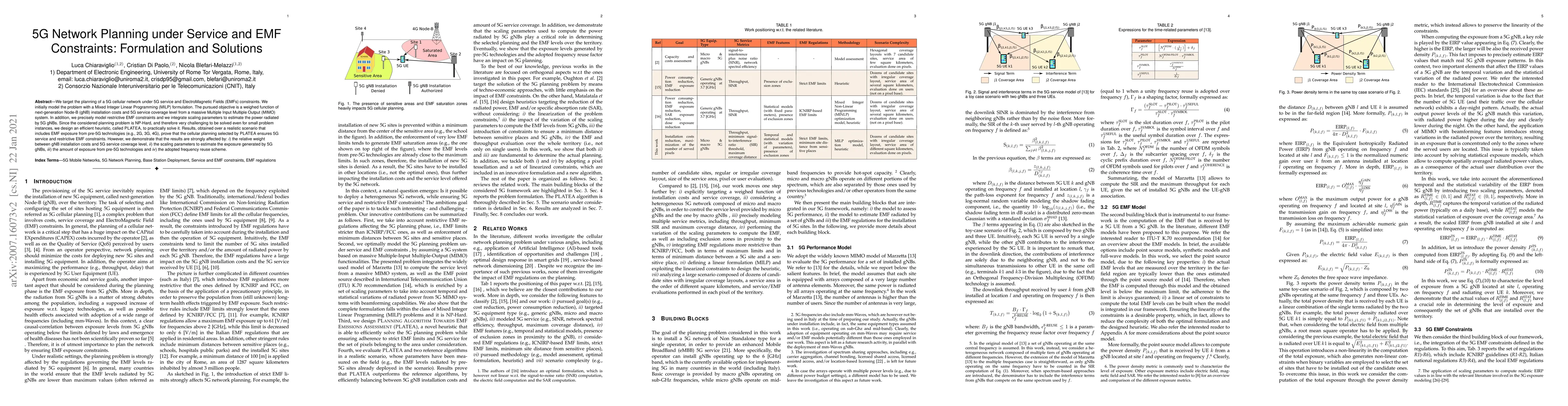 We target the planning of a 5G cellular network under 5G service and ElectroMagnetic Fields (EMFs) constraints. We initially model the problem with a Mixed Integer Linear Programming (MILP) formulation. The pursued objective is a weighed function of next-generation Node-B (gNB) installation costs and 5G service coverage level from a massive Multiple Input Multiple Output (MIMO) system. In addition, we precisely model restrictive EMF constraints and we integrate scaling parameters to estimate the power radiated by 5G gNBs. Since the considered planning problem is NP-Hard, and therefore very challenging to be solved even for small problem instances, we design an efficient heuristic, called PLATEA, to practically solve it. Results, obtained over a realistic scenario that includes EMF exposure from pre-5G technologies (e.g., 2G, 3G, 4G), prove that the cellular planning selected by PLATEA ensures 5G service and restrictive EMF constraints. However, we demonstrate that the results are strongly affected by: i) the relative weight between gNB installation costs and 5G service coverage level, ii) the scaling parameters to estimate the exposure generated by 5G gNBs, iii) the amount of exposure from pre-5G technologies and iv) the adopted frequency reuse scheme.