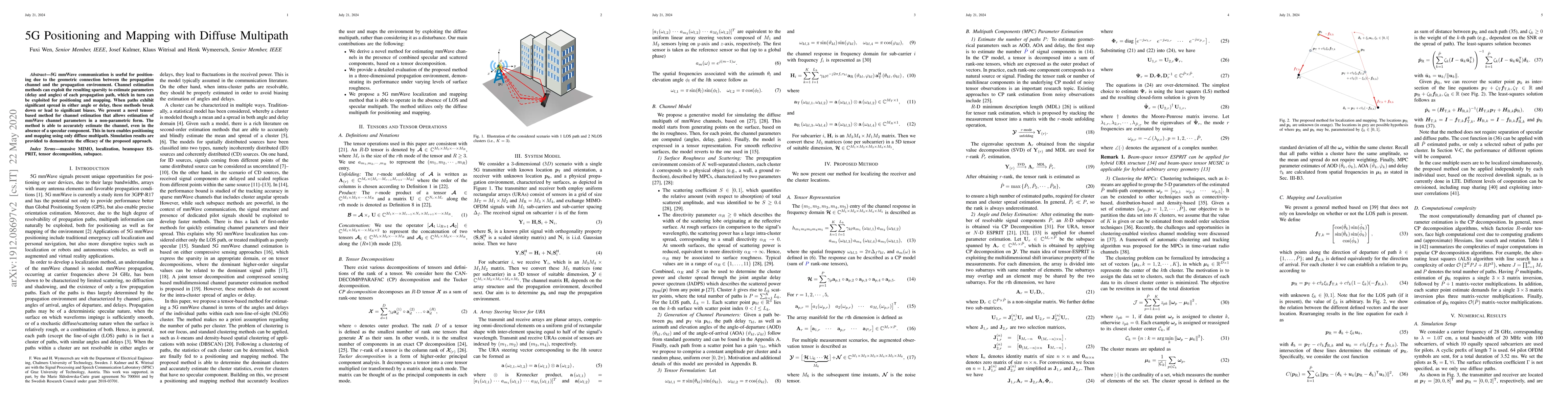 This paper introduces a novel tensor-based method for 5G mmWave channel estimation that accurately determines parameters even in the absence of a specular component, enabling precise positioning and mapping using only diffuse multipath. Simulation results validate the effectiveness of the proposed approach.