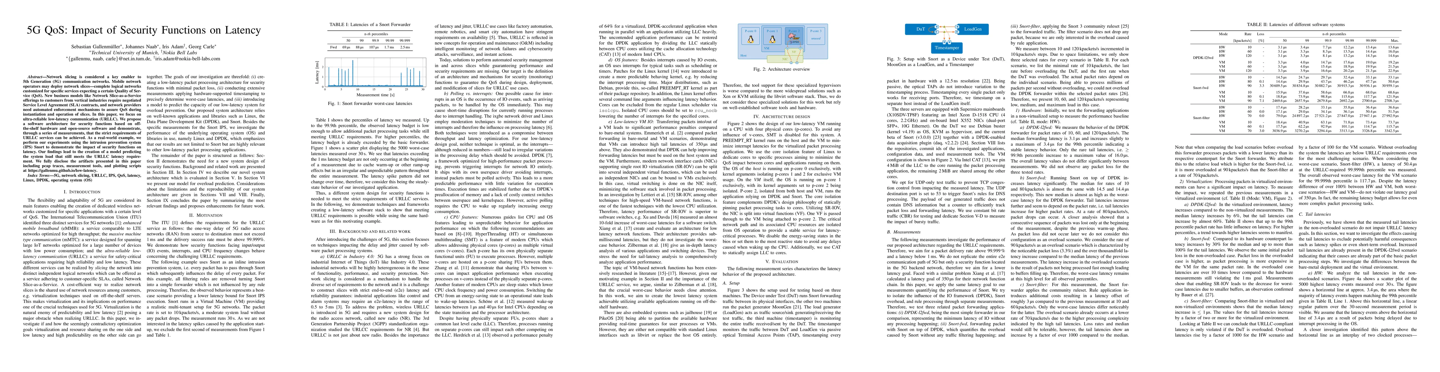 Network slicing is considered a key enabler to 5th Generation (5G) communication networks. Mobile network operators may deploy network slices -- complete logical networks customized for specific services expecting a certain Quality of Service (QoS). New business models like Network Slice-as-a-Service offerings to customers from vertical industries require negotiated Service Level Agreement (SLA) contracts, and network providers need automated enforcement mechanisms to assure QoS during instantiation and operation of slices. In this paper, we focus on ultra-reliable low-latency communication (URLLC). We propose a software architecture for security functions based on off-the-shelf hardware and open-source software and demonstrate, through a series of measurements, that the strict requirements of URLLC services can be achieved. As a real-world example, we perform our experiments using the intrusion prevention system (IPS) Snort to demonstrate the impact of security functions on latency. Our findings lead to the creation of a model predicting the system load that still meets the URLLC latency requirement. We fully disclose the artifacts presented in this paper including pcap traces, measurement tools, and plotting scripts at https://gallenmu.github.io/low-latency.