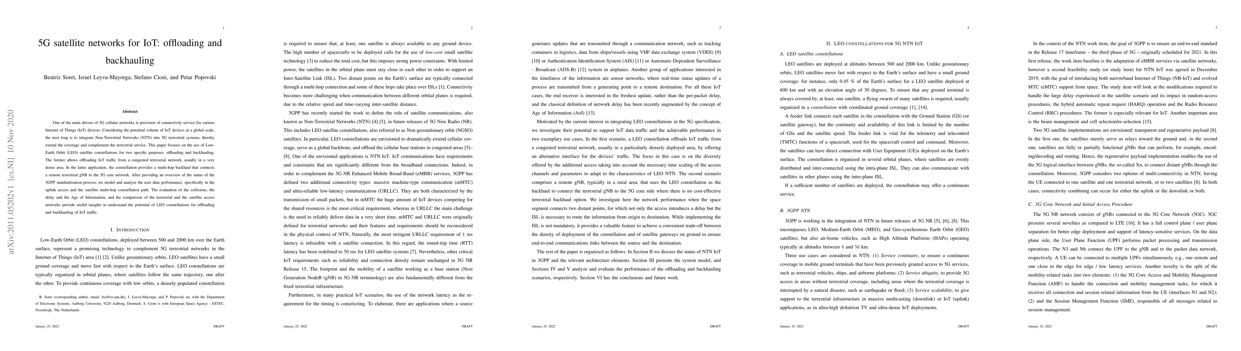 This paper explores the integration of Low-Earth Orbit (LEO) satellite constellations into 5G networks to enhance Internet of Things (IoT) connectivity through offloading and backhauling. It evaluates user data performance, collision, delay, and Age of Information metrics to compare terrestrial and satellite networks, providing insights into LEO constellations' potential for IoT traffic management.