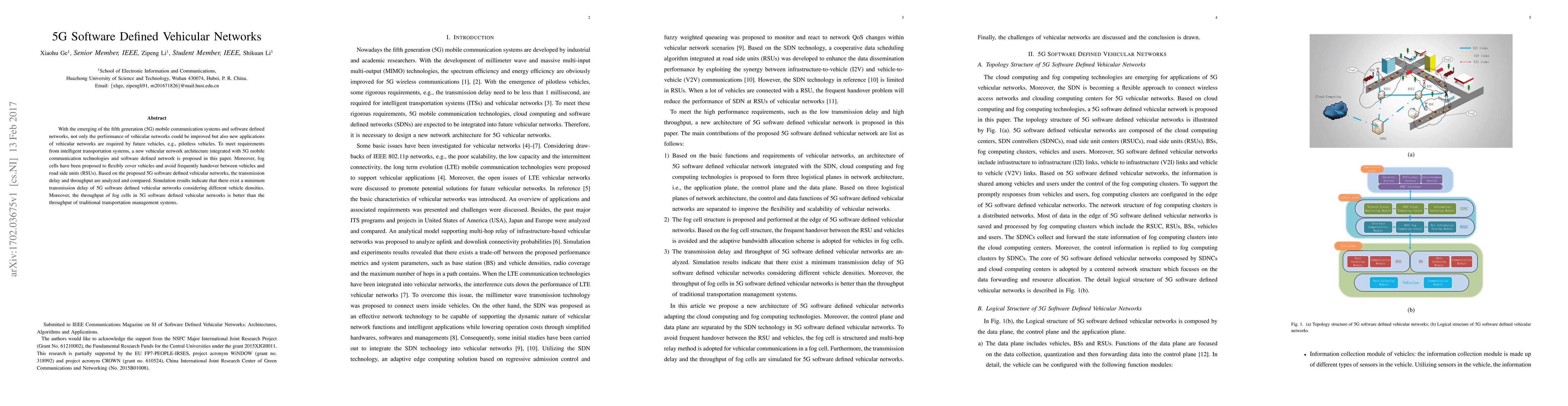 This paper proposes a new vehicular network architecture integrating 5G mobile communication and software defined networks, with fog cells to minimize handovers. Simulation results show reduced transmission delay and improved throughput compared to traditional systems.