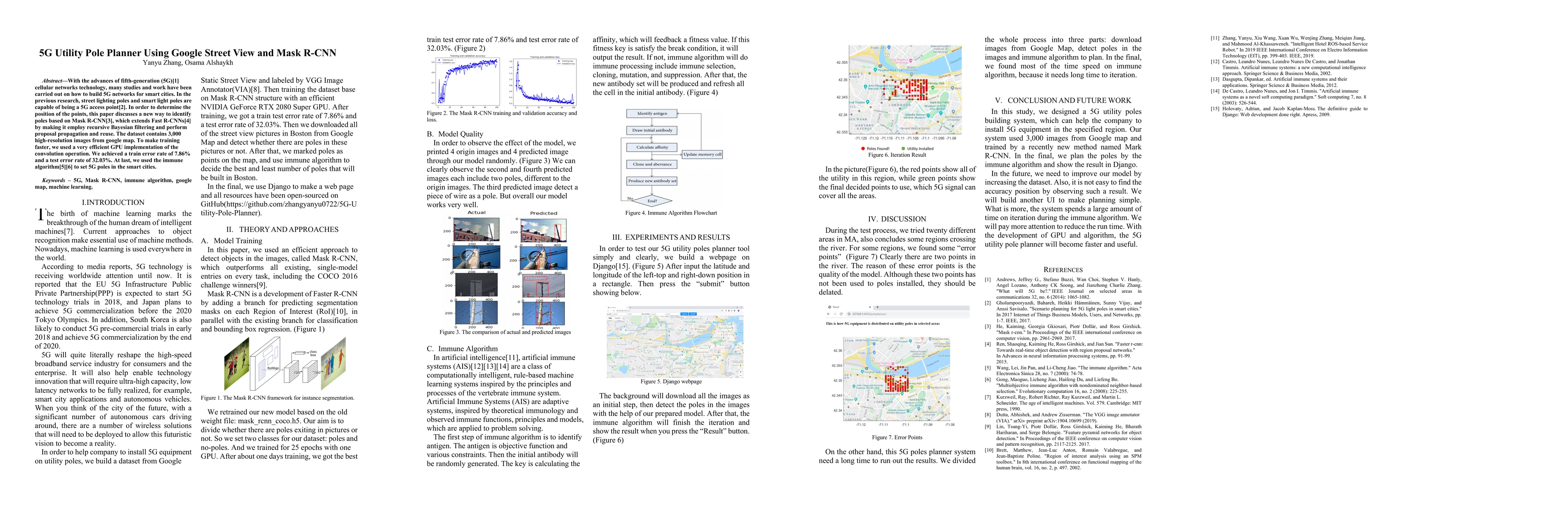 With the advances of fifth-generation (5G) cellular networks technology, many studies and work have been carried out on how to build 5G networks for smart cities. In the previous research, street lighting poles and smart light poles are capable of being a 5G access point. In order to determine the position of the points, this paper discusses a new way to identify poles based on Mask R-CNN, which extends Fast R-CNNs by making it employ recursive Bayesian filtering and perform proposal propagation and reuse. The dataset contains 3,000 high-resolution images from google map. To make training faster, we used a very efficient GPU implementation of the convolution operation. We achieved a train error rate of 7.86% and a test error rate of 32.03%. At last, we used the immune algorithm to set 5G poles in the smart cities.