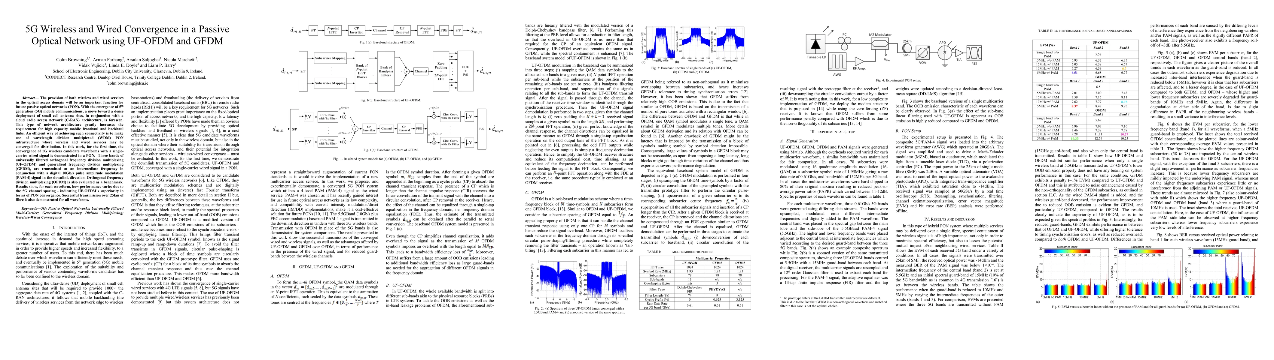 This paper demonstrates the convergence of 5G wireless and wired services in a passive optical network (PON) using UF-OFDM and GFDM. It shows superior performance of UF-OFDM over OFDM and successful transmission over 25km of fiber, highlighting its potential for high capacity fronthaul and backhaul links.