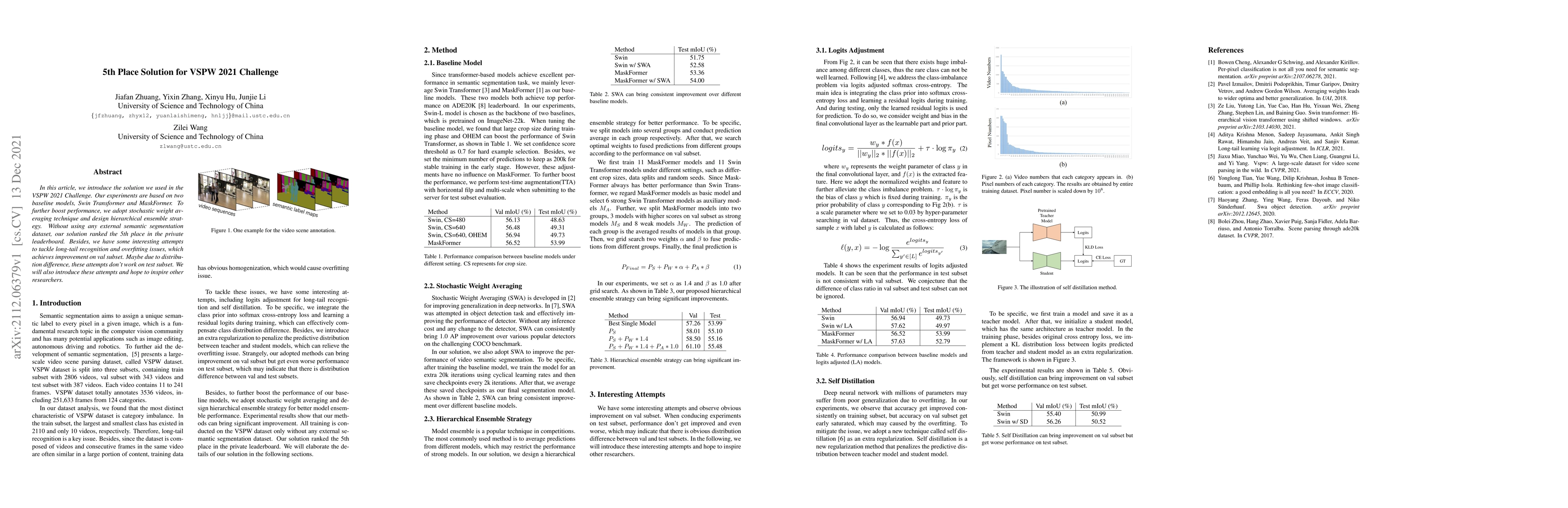 In this article, we introduce the solution we used in the VSPW 2021 Challenge. Our experiments are based on two baseline models, Swin Transformer and MaskFormer. To further boost performance, we adopt stochastic weight averaging technique and design hierarchical ensemble strategy. Without using any external semantic segmentation dataset, our solution ranked the 5th place in the private leaderboard. Besides, we have some interesting attempts to tackle long-tail recognition and overfitting issues, which achieves improvement on val subset. Maybe due to distribution difference, these attempts don't work on test subset. We will also introduce these attempts and hope to inspire other researchers.