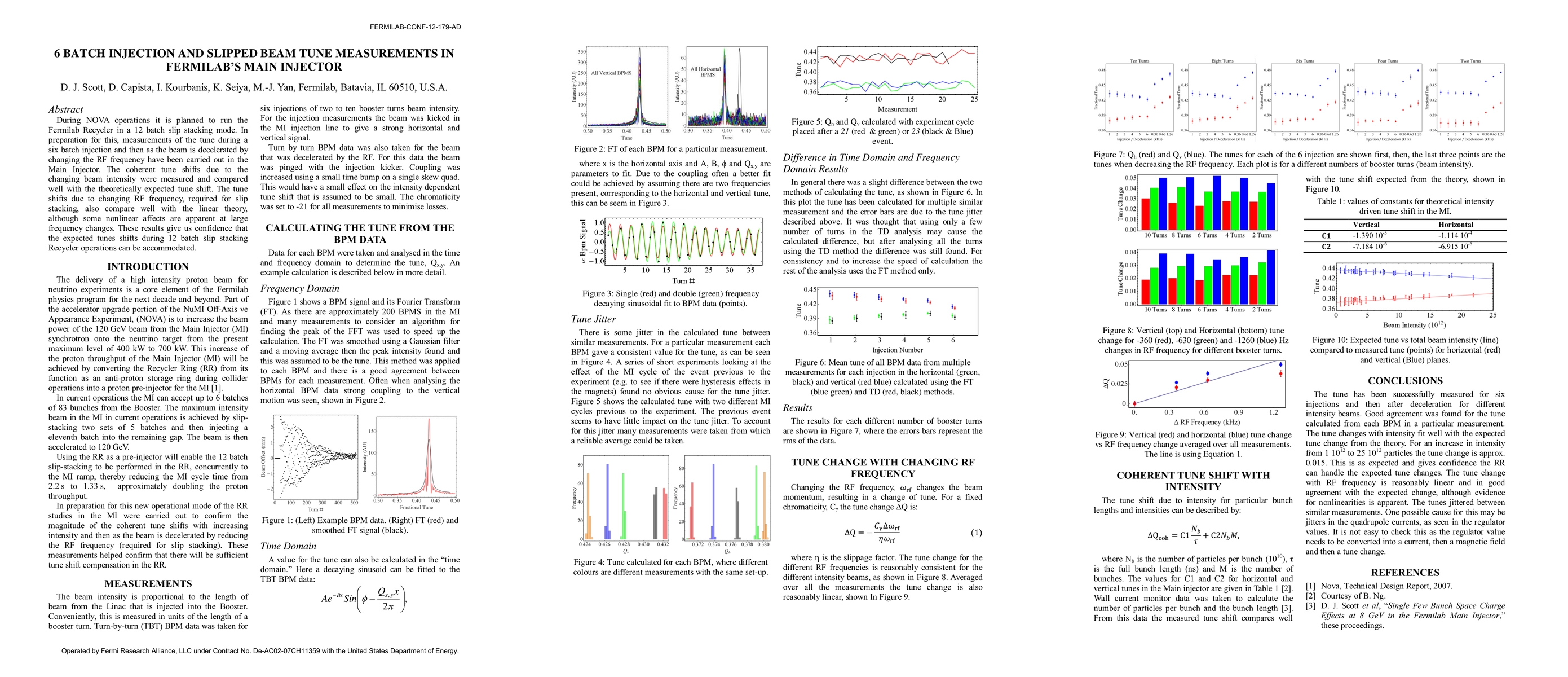 This study measures tune shifts in Fermilab's Main Injector during six batch injection and slipped beam operations, comparing observed shifts to theoretical predictions. Results confirm that anticipated tune shifts during 12 batch slip stacking in the Recycler can be managed, despite some nonlinear effects at large frequency changes.