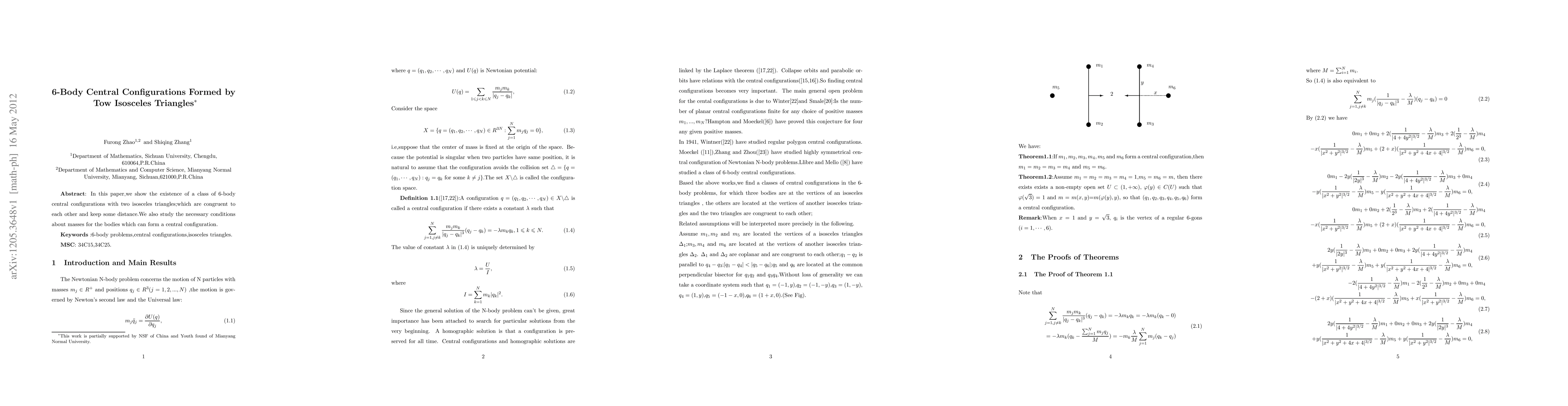 This paper demonstrates the existence of a unique 6-body central configuration formed by two congruent isosceles triangles maintaining a specific distance, and investigates the mass conditions required for such configurations.