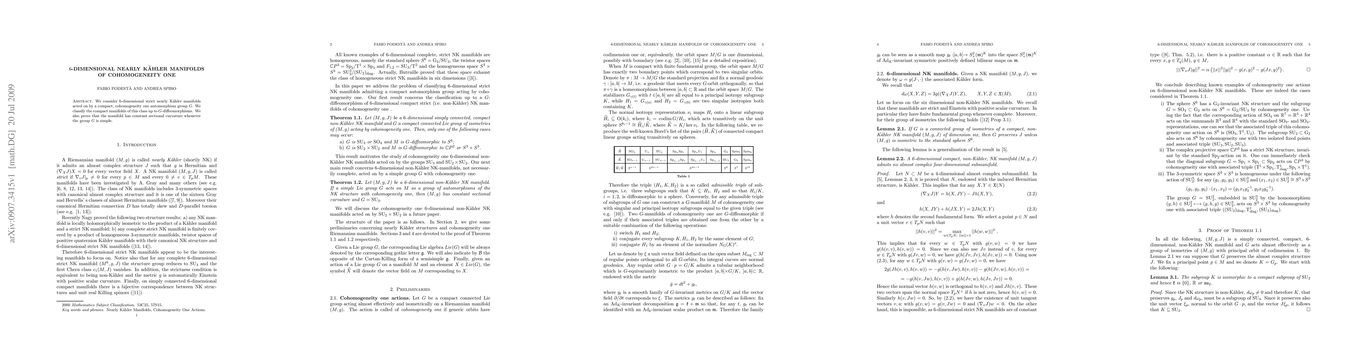 This paper classifies compact 6-dimensional strict nearly Kaehler manifolds with a cohomogeneity one automorphism group G, and proves that such manifolds have constant sectional curvature if G is simple.