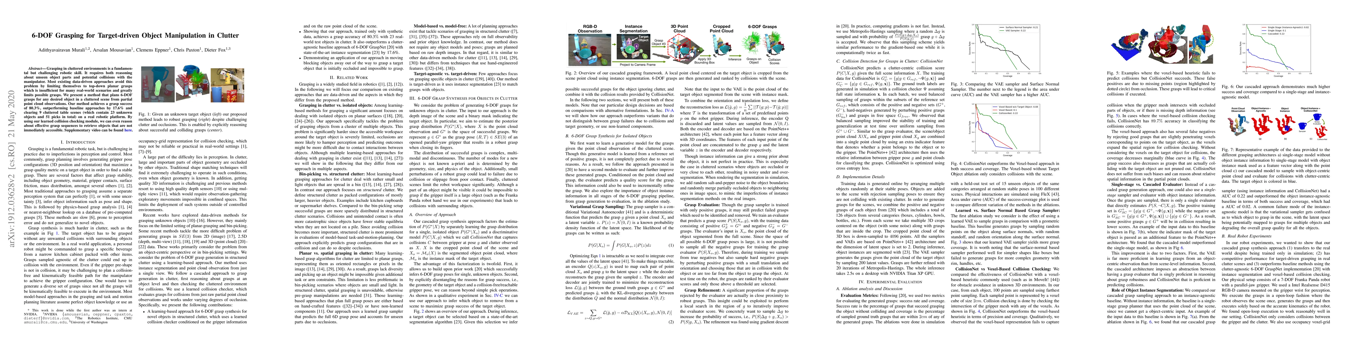 Grasping in cluttered environments is a fundamental but challenging robotic skill. It requires both reasoning about unseen object parts and potential collisions with the manipulator. Most existing data-driven approaches avoid this problem by limiting themselves to top-down planar grasps which is insufficient for many real-world scenarios and greatly limits possible grasps. We present a method that plans 6-DOF grasps for any desired object in a cluttered scene from partial point cloud observations. Our method achieves a grasp success of 80.3%, outperforming baseline approaches by 17.6% and clearing 9 cluttered table scenes (which contain 23 unknown objects and 51 picks in total) on a real robotic platform. By using our learned collision checking module, we can even reason about effective grasp sequences to retrieve objects that are not immediately accessible. Supplementary video can be found at https://youtu.be/w0B5S-gCsJk.