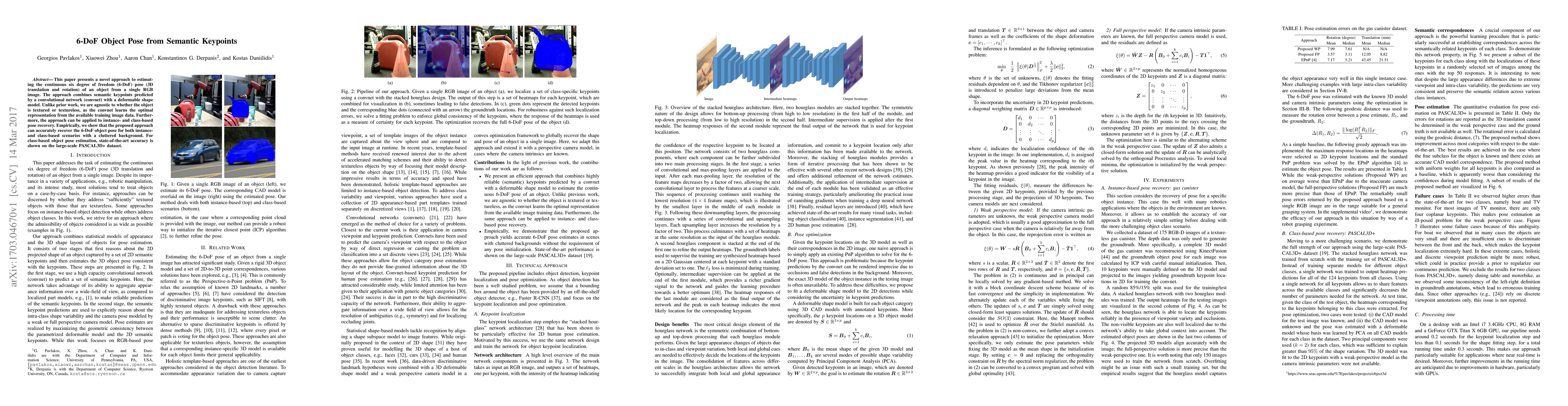 This paper introduces a method for estimating 6-DoF object pose using semantic keypoints and a deformable shape model, which is effective for both textured and textureless objects. The approach demonstrates high accuracy in instance- and class-based pose recovery, achieving state-of-the-art results on the PASCAL3D+ dataset.