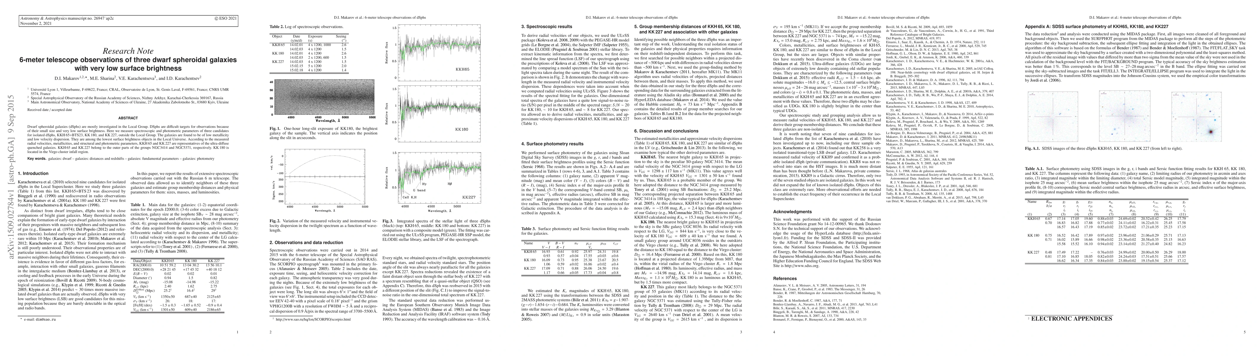 This study uses the 6-meter telescope to observe three ultra-diffuse dwarf spheroidal galaxies (dSphs) outside the Local Group, finding them to have low metallicity and low velocity dispersion. KKH65 and KK227, located in the outskirts of NGC3414 and NGC5371 groups, respectively, are identified as ultra-diffuse quenched galaxies.