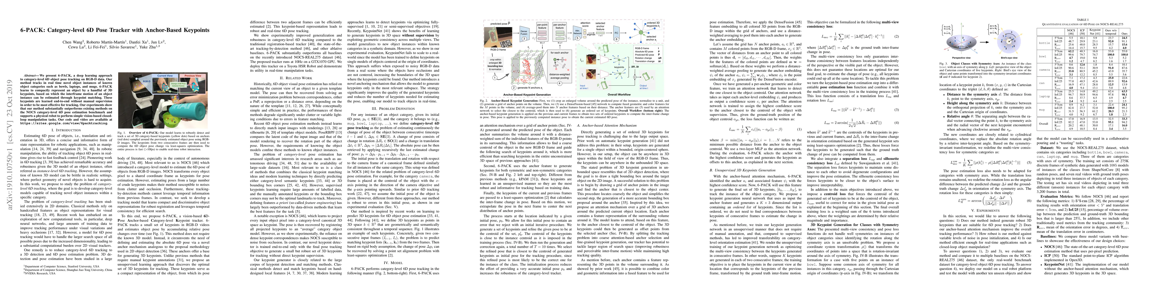 6-PACK is a deep learning method for real-time 6D pose tracking of known object categories using RGB-D data. It identifies and tracks 3D keypoints learned end-to-end for effective interframe motion estimation, outperforming existing methods and enabling vision-based robot manipulation.