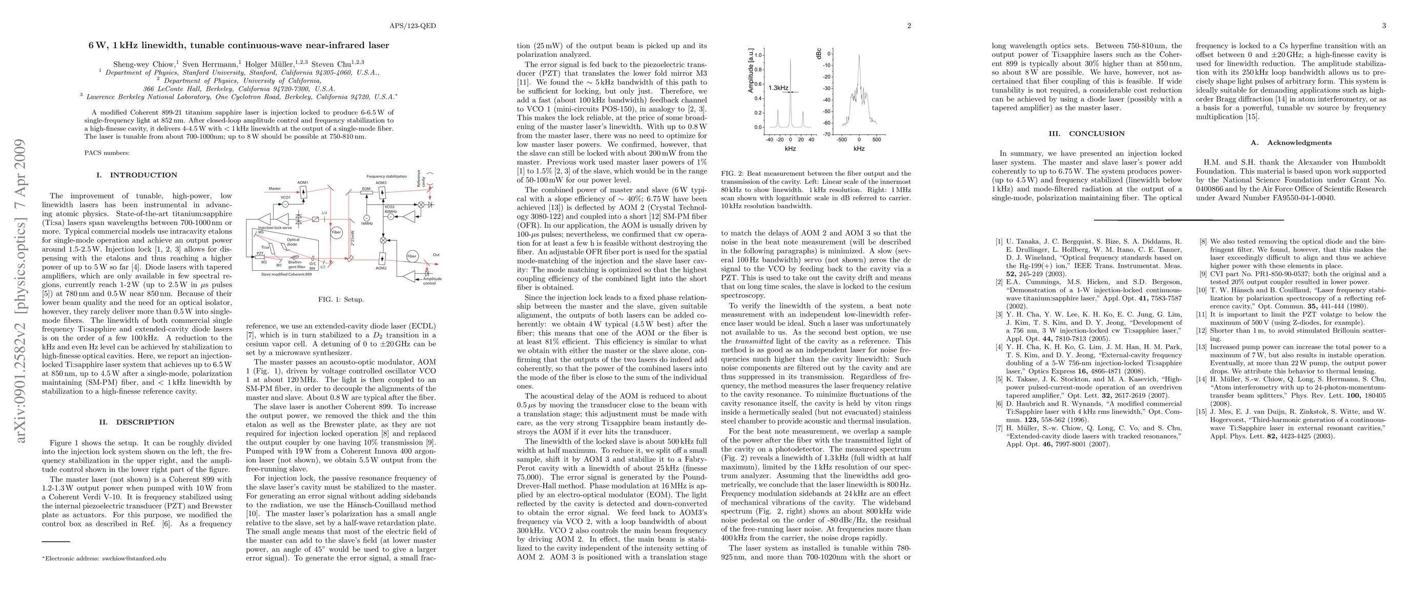 This paper describes a modified Coherent 899-21 titanium sapphire laser that injects locked to generate 6-6.5 W of tunable, continuous-wave near-infrared light at 852 nm, with a final output of 4-4.5 W and <1 kHz linewidth via a single-mode fiber.