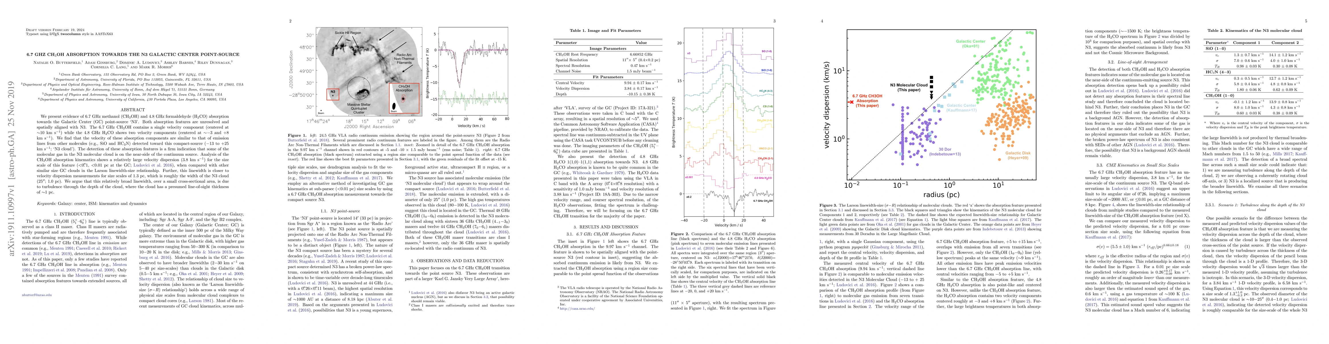This paper reports the detection of 6.7 GHz methanol absorption towards the Galactic Center's N3 point-source, indicating molecular gas on the near-side of the continuum source. The methanol absorption shows a single velocity component, while formaldehyde absorption exhibits two components, suggesting turbulence in the N3 cloud.