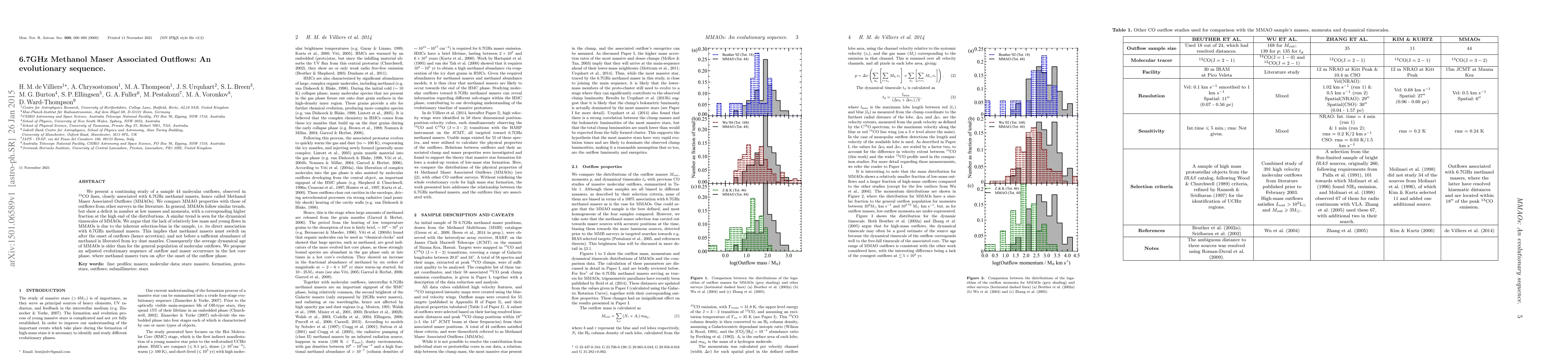 We present a continuing study of a sample 44 molecular outflows, observed in 13CO lines, closely associated with 6.7GHz methanol masers, hence called Methanol Maser Associated Outflows (MMAOs). We compare MMAO properties with those of outflows from other surveys in the literature. In general, MMAOs follow similar trends, but show a deficit in number at low masses and momenta, with a corresponding higher fraction at the high end of the distributions. A similar trend is seen for the dynamical timescales of MMAOs. We argue that the lack of relatively low mass and young flows in MMAOs is due to the inherent selection-bias in the sample, i.e. its direct association with 6.7GHz methanol masers. This implies that methanol masers must switch on after the onset of outflows (hence accretion), and not before a sufficient abundance of methanol is liberated from icy dust mantles. Consequently the average dynamical age of MMAOs is older than for the general population of molecular outflows. We propose an adjusted evolutionary sequence of outflow and maser occurrence in the hot core phase, where methanol masers turn on after the onset of the outflow phase.