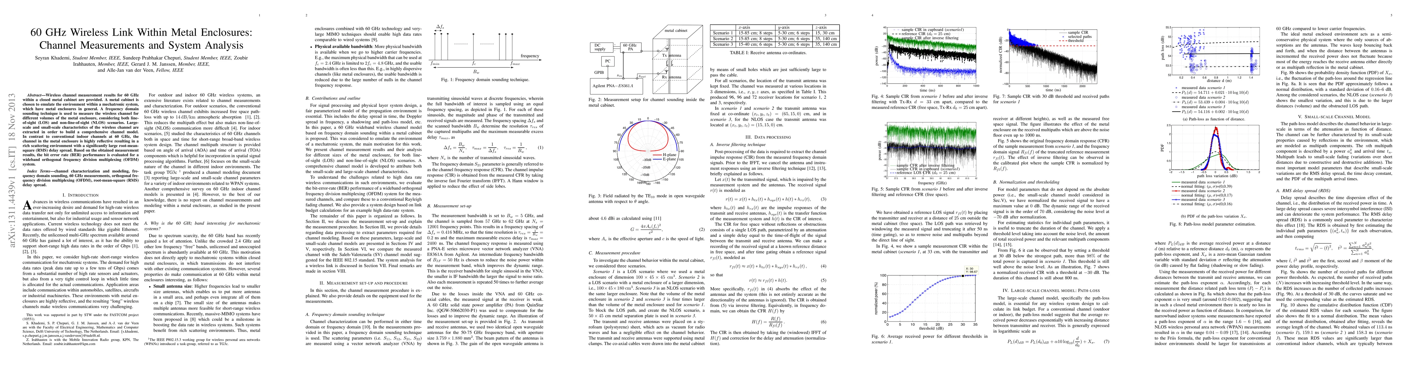 Wireless channel measurement results for 60 GHz within a closed metal cabinet are provided. A metal cabinet is chosen to emulate the environment within a mechatronic system, which have metal enclosures in general. A frequency domain sounding technique is used to measure the wireless channel for different volumes of the metal enclosure, considering both line-of-sight (LOS) and non-line-of-sight (NLOS) scenarios. Large-scale and small-scale characteristics of the wireless channel are extracted in order to build a comprehensive channel model. In contrast to conventional indoor channels at 60 GHz, the channel in the metal enclosure is highly reflective resulting in a rich scattering environment with a significantly large root-mean-square (RMS) delay spread. Based on the obtained measurement results, the bit error rate (BER) performance is evaluated for a wideband orthogonal frequency division multiplexing (OFDM) system.