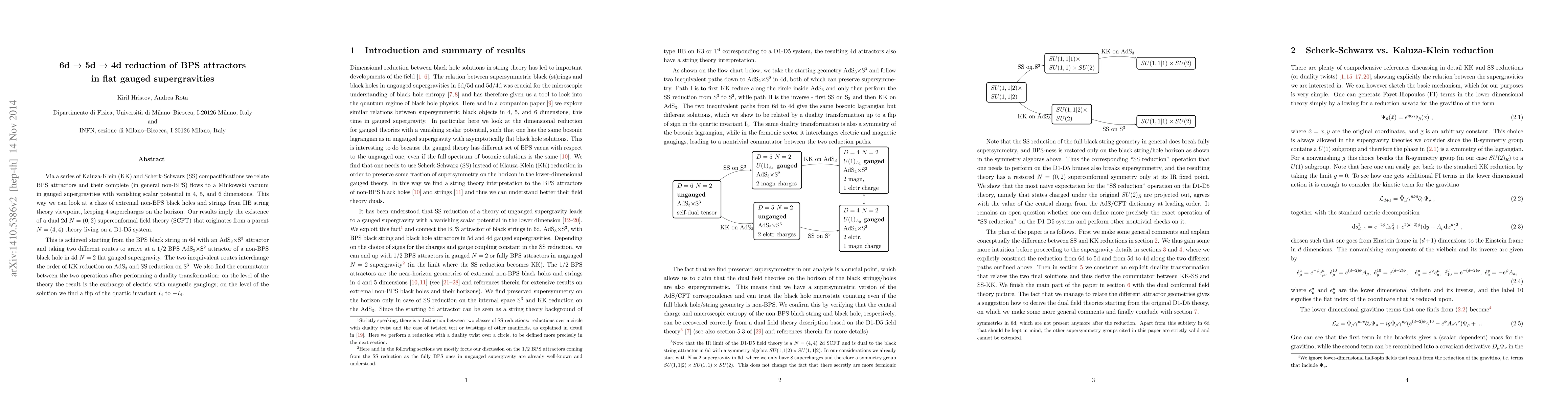This paper investigates the BPS attractors in gauged supergravities through 6d-5d-4d reductions, showing how these relate to Minkowski vacua. It demonstrates a dual 2d N=(0,2) SCFT from an N=(4,4) theory in D1-D5 systems, revealing the commutator effects in the reduction process.