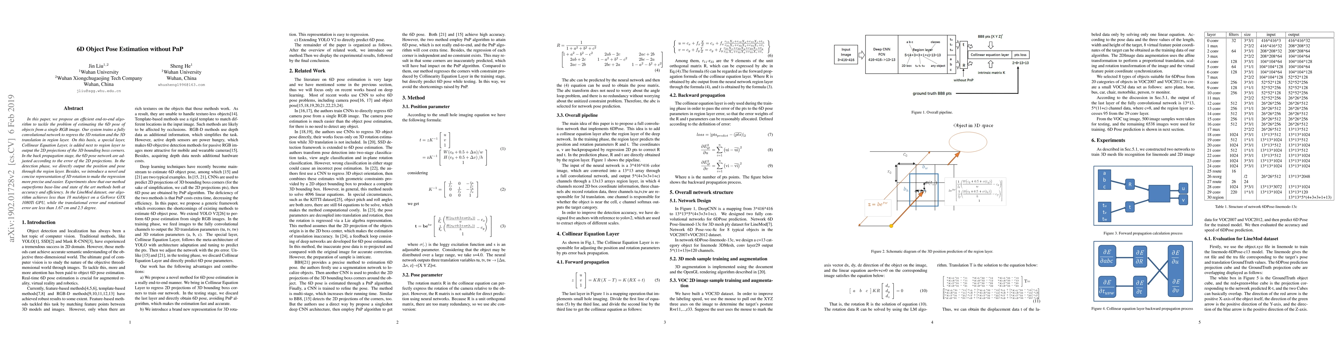 In this paper, we propose an efficient end-to-end algorithm to tackle the problem of estimating the 6D pose of objects from a single RGB image. Our system trains a fully convolutional network to regress the 3D rotation and the 3D translation in region layer. On this basis, a special layer, Collinear Equation Layer, is added next to region layer to output the 2D projections of the 3D bounding boxs corners. In the back propagation stage, the 6D pose network are adjusted according to the error of the 2D projections. In the detection phase, we directly output the position and pose through the region layer. Besides, we introduce a novel and concise representation of 3D rotation to make the regression more precise and easier. Experiments show that our method outperforms base-line and state of the art methods both at accuracy and efficiency. In the LineMod dataset, our algorithm achieves less than 18 ms/object on a GeForce GTX 1080Ti GPU, while the translational error and rotational error are less than 1.67 cm and 2.5 degree.