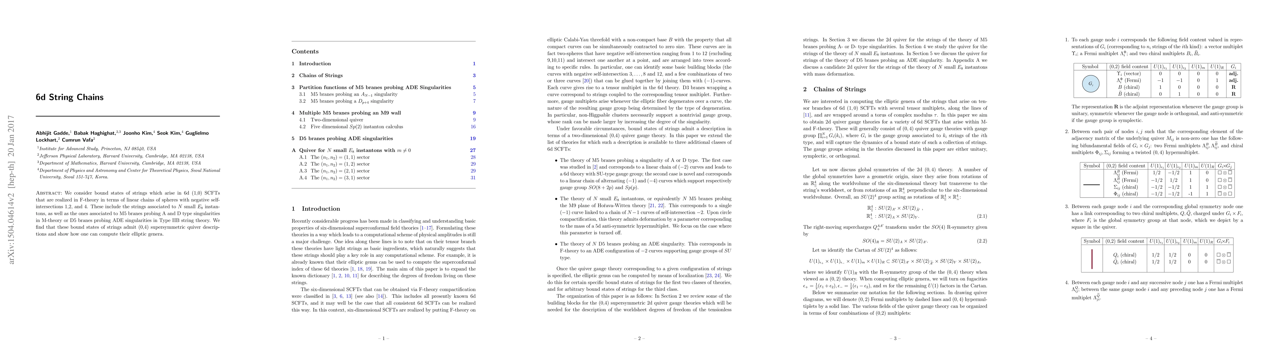 This paper explores bound states of strings in 6d (1,0) SCFTs realized through F-theory, focusing on linear chains of spheres with self-intersections of -1, -2, and -4. It reveals (0,4) supersymmetric quiver descriptions for these string configurations and presents methods to compute their elliptic genera.