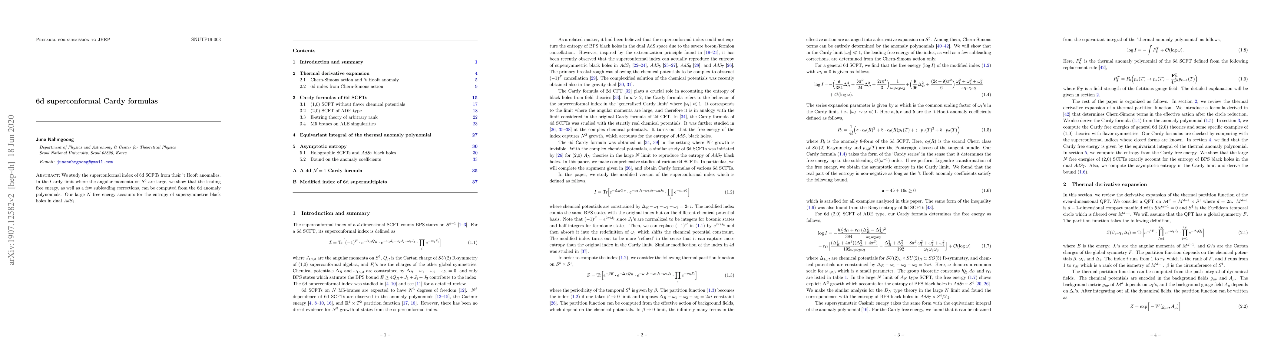 Summary: This paper derives superconformal Cardy formulas for 6d SCFTs using 't Hooft anomalies, showing that the leading free energy and subleading corrections can be computed from these anomaly polynomials, with the large N free energy correlating to the entropy of supersymmetric black holes in dual AdS7.