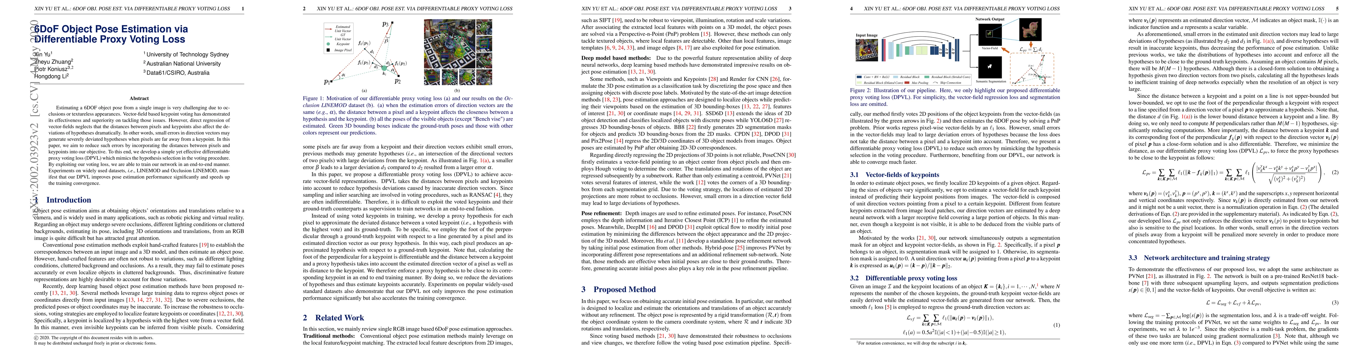 This paper proposes a differentiable proxy voting loss (DPVL) to enhance 6DOF object pose estimation from single images by incorporating pixel-keypoint distances into the objective, leading to improved performance and faster training convergence on datasets like LINEMOD and Occlusion LINEMOD.
