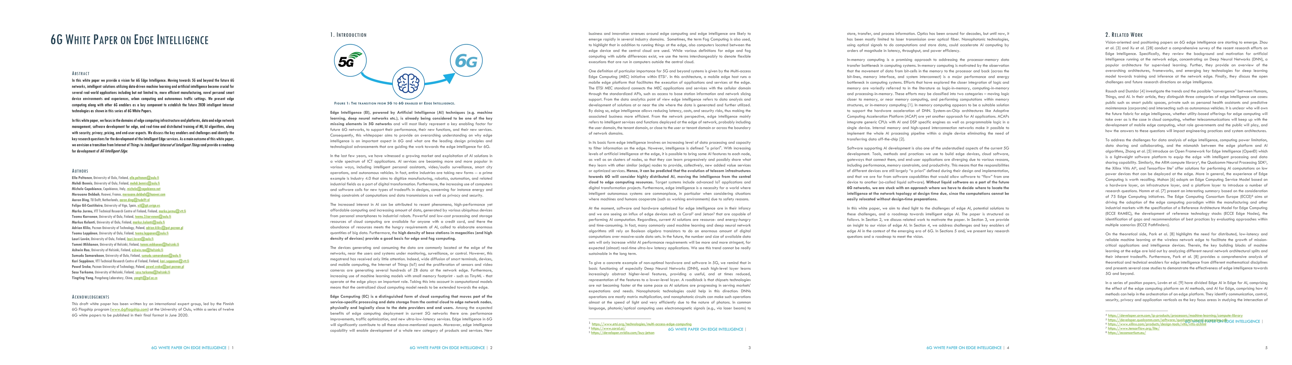 This white paper outlines a vision for 6G Edge Intelligence, emphasizing the role of data-driven machine learning and AI in future networks. It discusses edge computing, infrastructure, and management, alongside security and privacy, as key components for developing Intelligent Internet of Things by 2030.