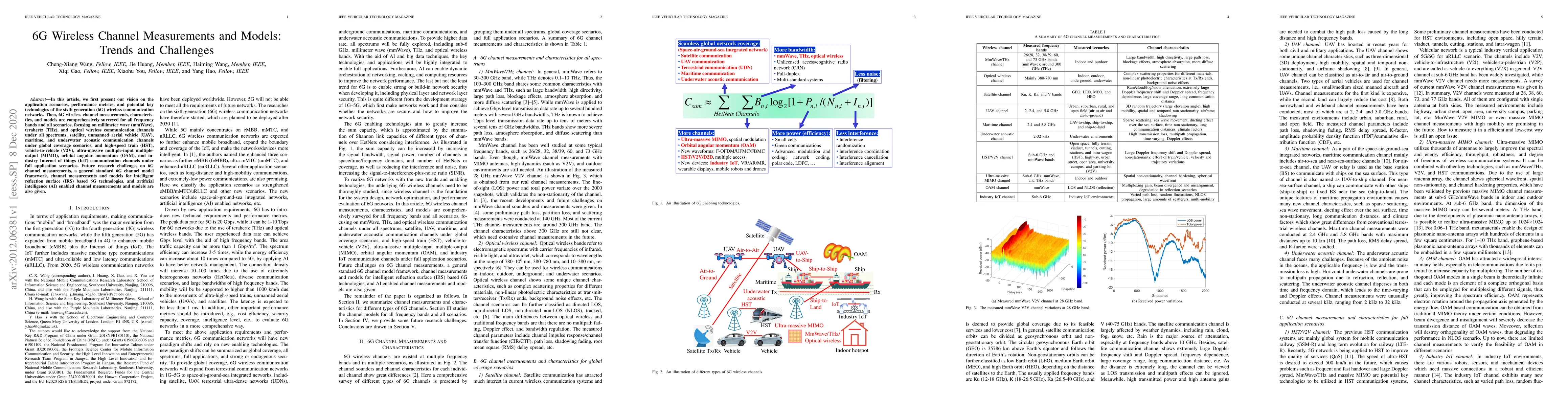 In this article, we first present our vision on the application scenarios, performance metrics, and potential key technologies of the sixth generation (6G) wireless communication networks. Then, 6G wireless channel measurements, characteristics, and models are comprehensively surveyed for all frequency bands and all scenarios, focusing on millimeter wave (mmWave), terahertz (THz), and optical wireless communication channels under all spectrums, satellite, unmanned aerial vehicle (UAV), maritime, and underwater acoustic communication channels under global coverage scenarios, and high-speed train (HST), vehicle-to-vehicle (V2V), ultra-massive multiple-input multiple-output (MIMO), orbital angular momentum (OAM), and industry Internet of things (IoT) communication channels under full application scenarios. Future research challenges on 6G channel measurements, a general standard 6G channel model framework, channel measurements and models for intelligent reflection surface (IRS) based 6G technologies, and artificial intelligence (AI) enabled channel measurements and models are also given.