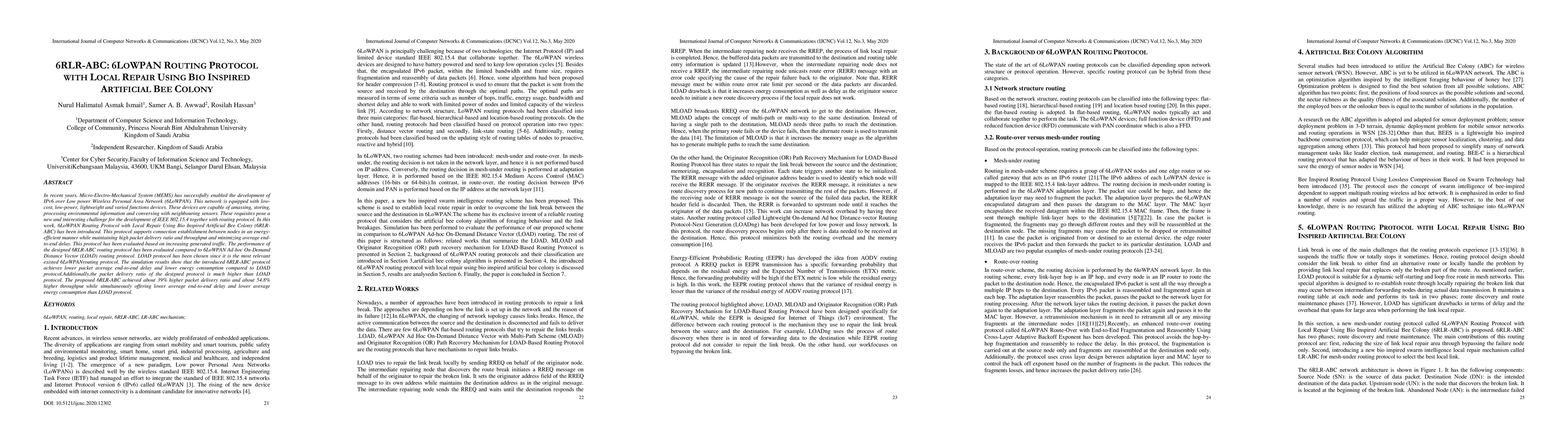 A new routing protocol called 6RLR-ABC improves packet delivery ratio and throughput while reducing energy consumption in 6LoWPAN networks.