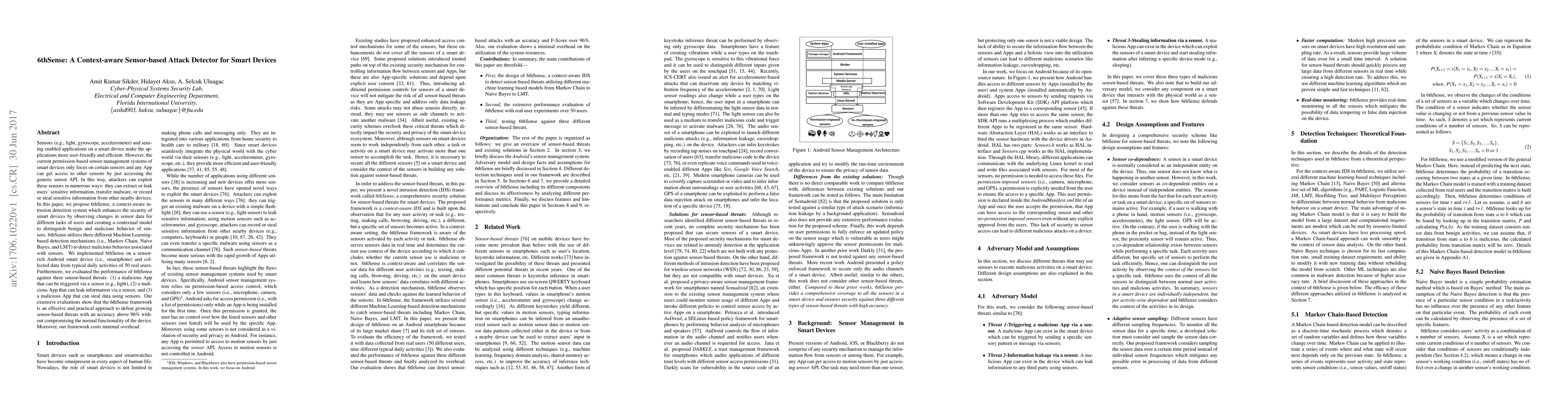 6thSense is a context-aware security system for smart devices that uses machine learning to detect malicious sensor usage, effectively identifying threats like data extraction, malware transfer, and data theft with over 96% accuracy, while imposing minimal performance overhead.