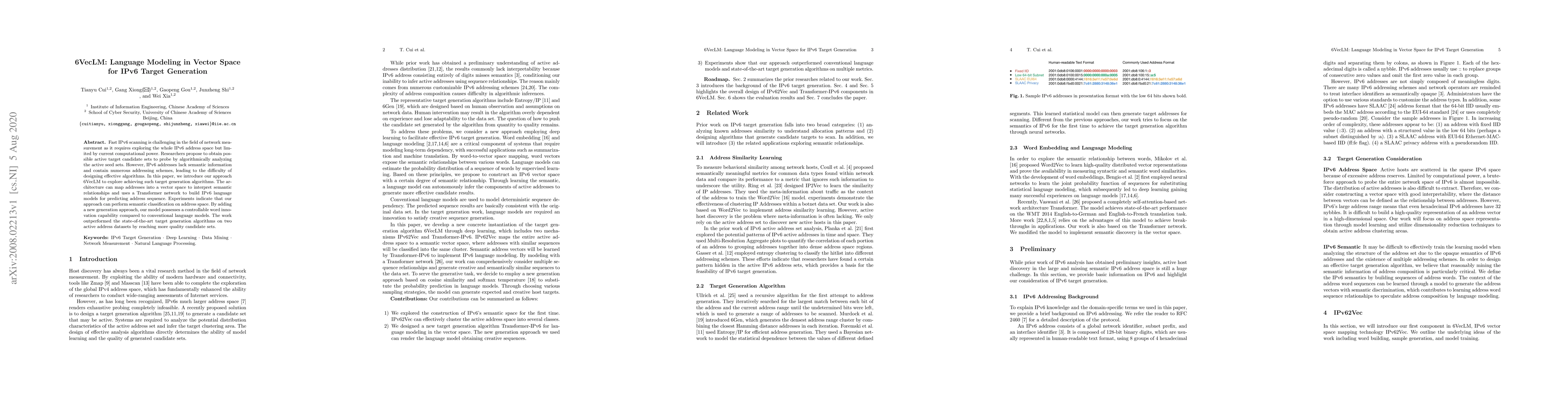 The paper introduces 6VecLM, a language modeling approach that maps IPv6 addresses into a vector space to interpret semantic relationships and predict address sequences, outperforming existing algorithms in generating high-quality active target candidate sets for IPv6 scanning. This method leverages a Transformer network to achieve semantic classification and controllable word innovation.