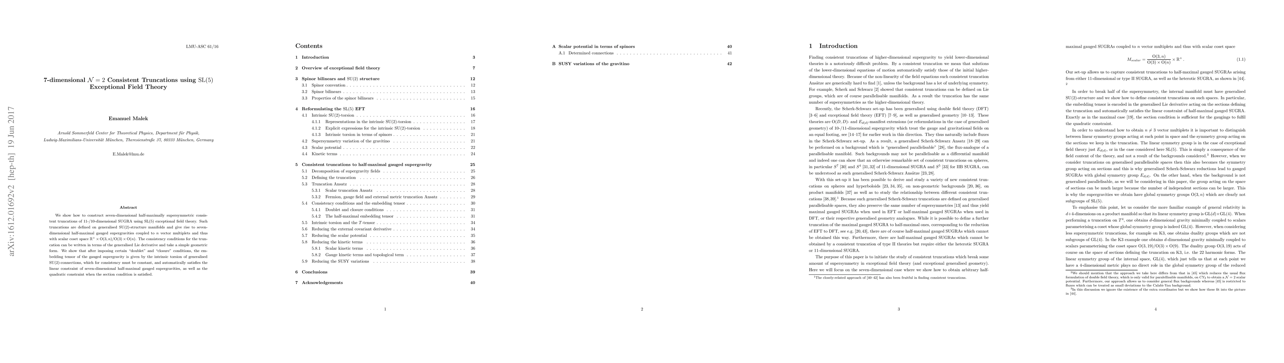 This paper constructs seven-dimensional half-maximally supersymmetric truncations of 11-/10-dimensional supergravity using $\mathrm{SL}(5)$ exceptional field theory, defining them on generalised $\mathrm{SU}(2)$-structure manifolds. The resulting theories are gauged supergravities with specific scalar coset spaces and constraints automatically satisfied by the embedding tensor.