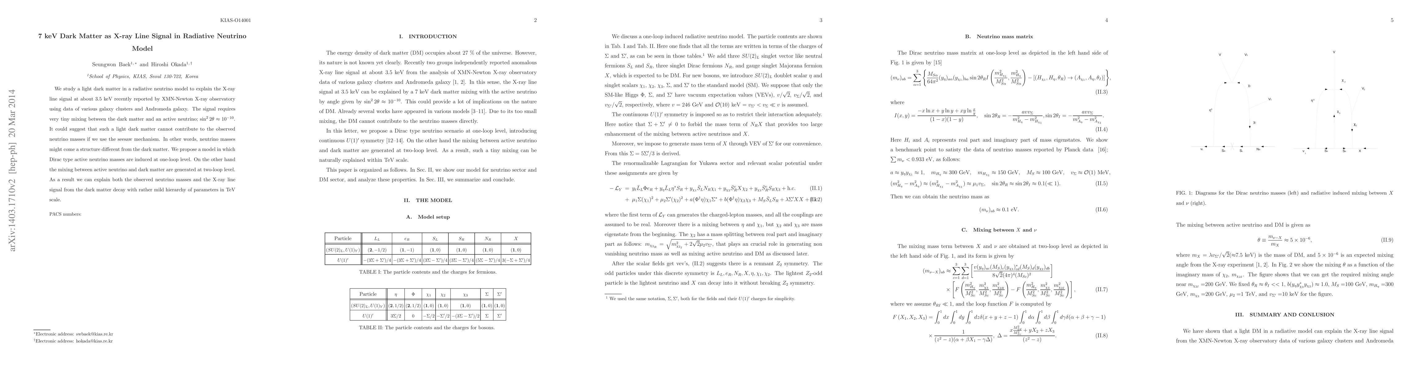 We study a light dark matter in a radiative neutrino model to explain the X-ray line signal at about $3.5$ keV recently reported by XMN-Newton X-ray observatory using data of various galaxy clusters and Andromeda galaxy. The signal requires very tiny mixing between the dark matter and an active neutrino; $\sin^2 2\theta\approx 10^{-10}$. It could suggest that such a light dark matter cannot contribute to the observed neutrino masses if we use the seesaw mechanism. In other words, neutrino masses might come a structure different from the dark matter. We propose a model in which Dirac type active neutrino masses are induced at one-loop level. On the other hand the mixing between active neutrino and dark matter are generated at two-loop level. As a result we can explain both the observed neutrino masses and the X-ray line signal from the dark matter decay with rather mild hierarchy of parameters in TeV scale.