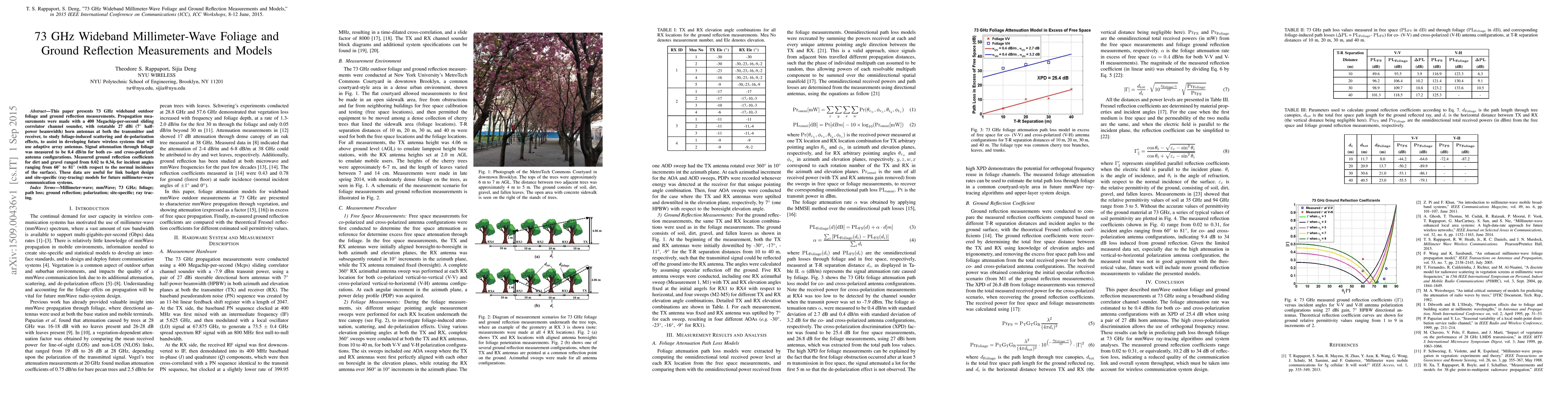 This paper presents 73 GHz wideband outdoor foliage and ground reflection measurements. Propagation measurements were made with a 400 Megachip-per-second sliding correlator channel sounder, with rotatable 27 dBi (7 degrees half- power beamwidth) horn antennas at both the transmitter and receiver, to study foliage-induced scattering and de-polarization effects, to assist in developing future wireless systems that will use adaptive array antennas. Signal attenuation through foliage was measured to be 0.4 dB/m for both co- and cross-polarized antenna configurations. Measured ground reflection coefficients for dirt and gravel ranged from 0.02 to 0.34, for incident angles ranging from 60 degrees to 81 degrees (with respect to the normal incidence of the surface). These data are useful for link budget design and site-specific (ray-tracing) models for future millimeter-wave communication systems.
