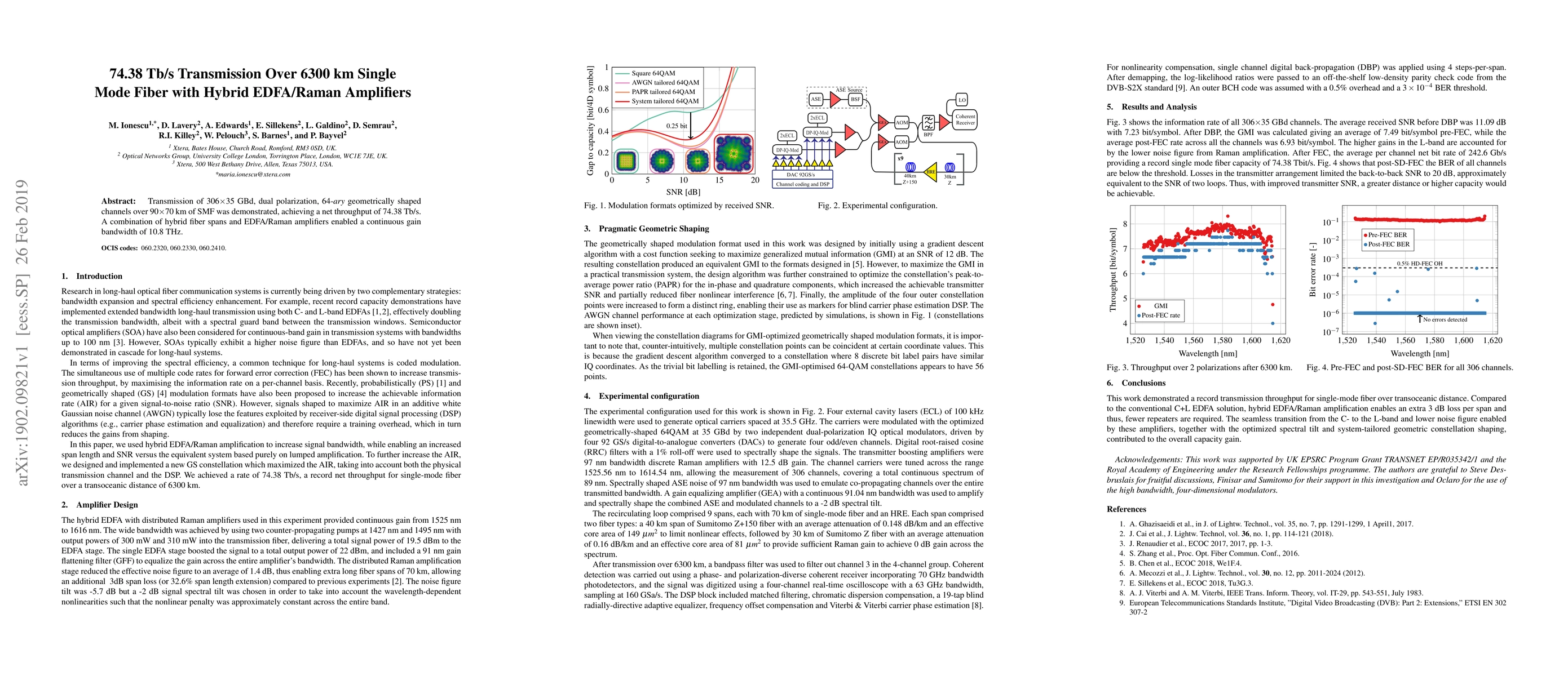 Summary: A research paper demonstrates a record 74.38 Tb/s data transmission over 6300 km using hybrid EDFA/Raman amplifiers, achieving 306x35 GBd dual polarization, 64-ary geometrically shaped channels, with a continuous gain bandwidth of 10.8 THz.